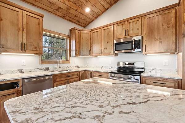- Ceiling Fan(s), Double Vanity, Granite Counters, Kitchen Island, Laundry On Main, Primary On Main, Smoke Detector, Tile Shower/Tub, Vaulted Ceiling(s), Walk-In Closet(s), Washer/Dryer Connection, Wood Ceiling(s)
