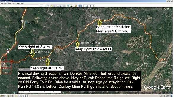 Hwy 299 access.... From the My T Fine Food Store in Bella Vista on Hwy 299 go 11 miles to property on both sides of the road minus the legal hwy frontage. (Can't drive into the property) Back way, (drive in way) into the property from Oak Run, CA.... (No cars or the like) Hwy 44E to Palo Cedro, CA exit. Left on Deschutes Rd. Right on Old Forty Four Dr. go 2 miles. Straight on Oak Run Road go 15.2 miles. Left on Donkey Mine Rd go 1.8 miles. Keep left at ''Y'' go 1.2 miles. Right at ''Y'' go .3 miles. Right at ''Y'' go 1/2 mile to Red Posts and start of property. Go another 1.2 to reach the bottom flat part of the property near the creek.