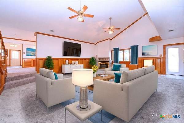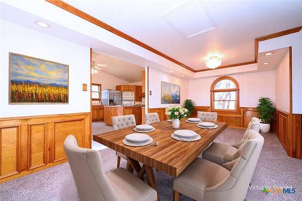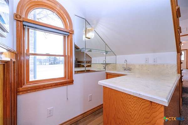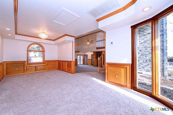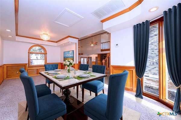 - Beamed Ceilings, Breakfast Area, Built In Features, Ceiling Fans, Crown Molding, Dining Area, Double Vanity, Eat In Kitchen, High Ceilings, Jetted Tub, Laminate Counters, Multiple Dining Areas, Natural Woodwork, Recessed Lighting, Separate Formal Dining Room, Separate Shower, Tray Ceilings, Tub Shower, Upper Level Primary, Walk In Closets, Wet Bar