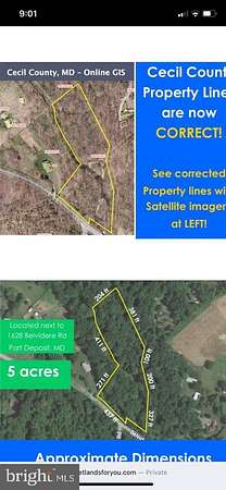 Let the kids and grandkids roam free in this gorgeous 5 acre property. This beautiful, wooded parcel in Cecil County Md,with its own brook is perfect getaway yet close to everything! Enjoy hunting, gardening, fishing, nature walks along the creek. The parcel has not been perked, but has home site (next to 1628 Belvedere rd) which slopes down, perfect for a beautiful deck and walk-out basement overlooking stream and woods below- imagine the views! Situated at the intersection of Belvidere and Linton run rd, the parcel is only 5-10 mins from schools, restaurants, shopping , numerous attractions, plus all the fishing , boating you could want on the Chesapeake Bay! Take you boat to the Pereyville or Charlestown boat ramps , both about 10 mins away and be in the Chesapeake in less than 30 mins! No HOA's! 5 acres Homesite, build your dream home on the fantastic wooded lot, there is a stream that boarders the south side and runs right next to the building building envelope. Have your little piece of paradise, let me imagination run wild, wooded retreat, farmette, or secluded homestead. the options are endless. Minutes from I95 Perryville, Port Deposit, I95 offeing easy access to Baltimore, Wilmington, DC and NYC! Property is on Belvidere Rd adjacent to Linton Run Rd