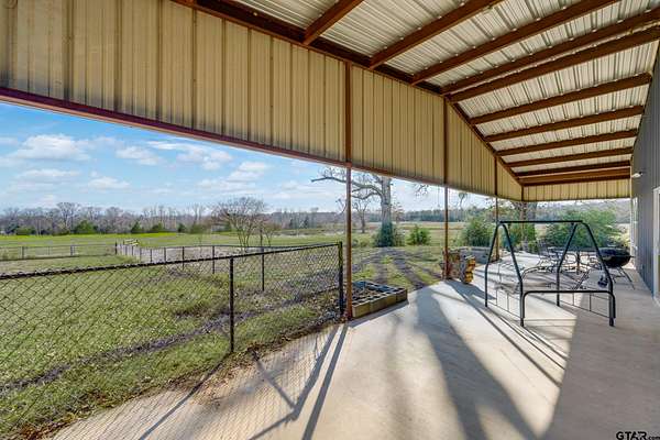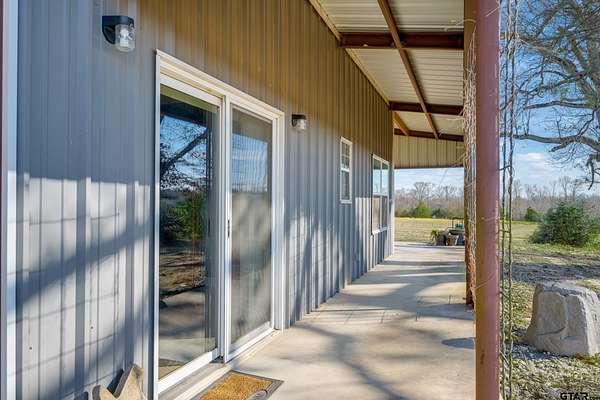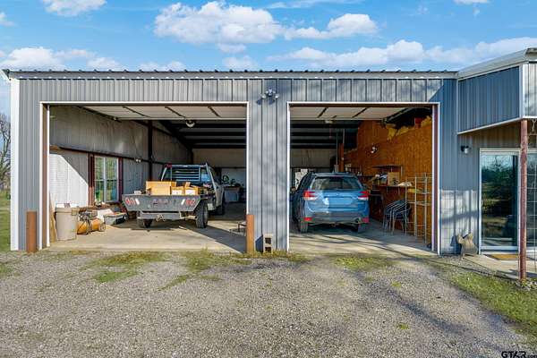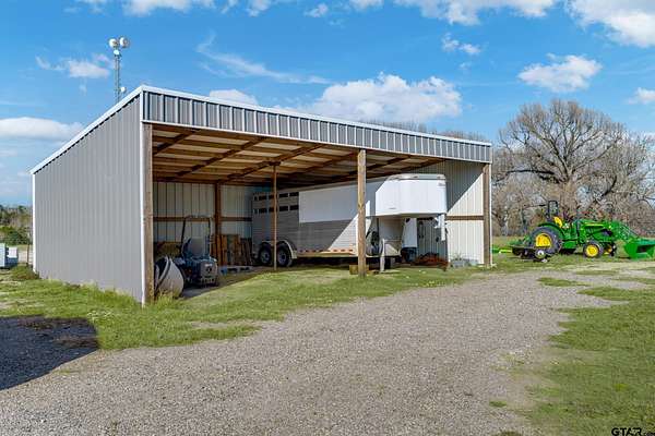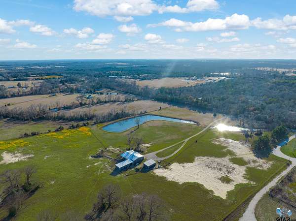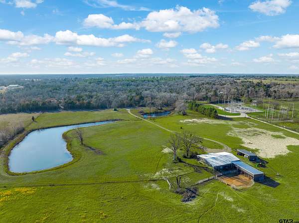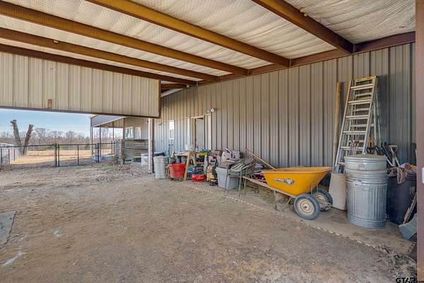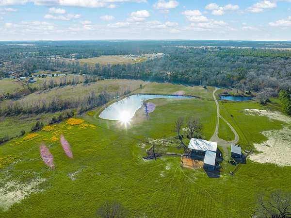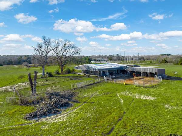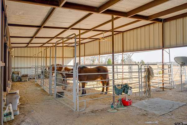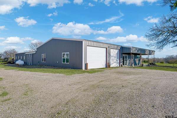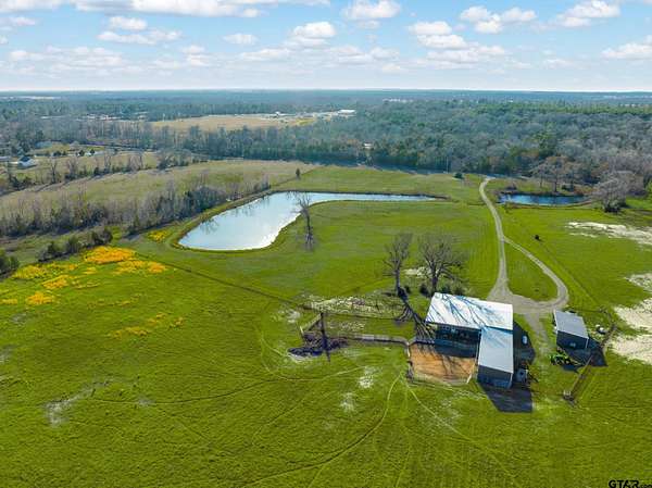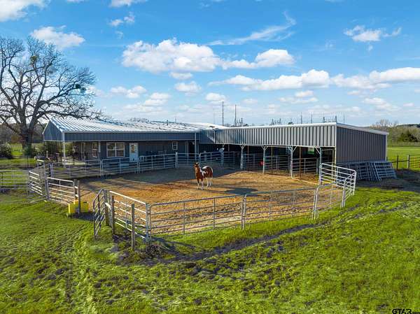 Enjoy peaceful country living in the rolling countryside of East Texas with this charming 2 bedroom, 2 bath barndominium built in 2013 and perfectly positioned on 27.58 acres of beautiful pastureland. Designed for comfort and functionality, this home features inviting covered porches on three sides--ideal for relaxing and taking in the serene views of your land and wildlife. Inside, you'll find wood-look tile flooring throughout and an open-concept layout that seamlessly connects the entry, dining, kitchen, and living areas--perfect for easy living. The home is also equipped with a whole-house water filtration system, providing enhanced water quality and a Generac generator providing peace of mind in all seasons. The spacious primary suite offers private access to the back porch, creating a peaceful retreat overlooking nature. The primary bath includes double sinks, a soaking tub, separate shower, and convenient access to the utility area. The property is well-equipped for livestock and outdoor enjoyment, featuring two picturesque ponds that are great for fishing, 663 feet of road frontage with a solar gate, and an ag exemption currently in place for hay production. Equestrian amenities include a 2,040 sq. ft. stable with four horse stalls and automatic waterers, fenced pasture ready for horses, plus a separate fenced area for dogs. Additional improvements include a 1500 sq. ft. garage plus a two-car carport, offering ample space for vehicles, equipment, and recreational toys. Whether you're seeking a horse property or private country retreat, this exceptional acreage offers endless possibilities in a beautiful rural setting.