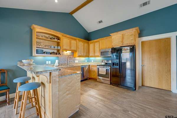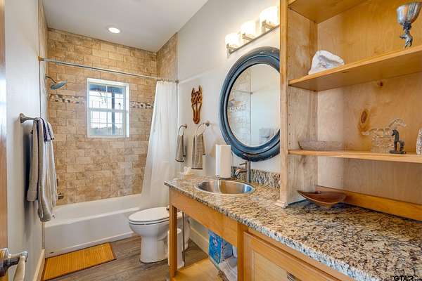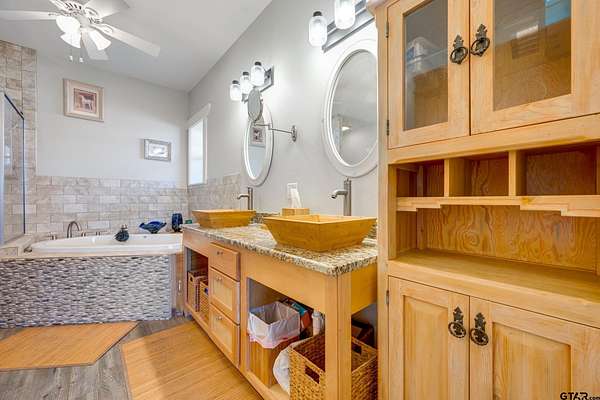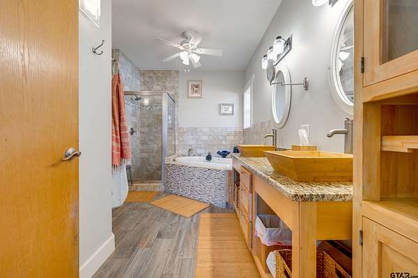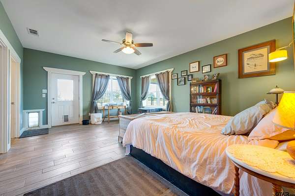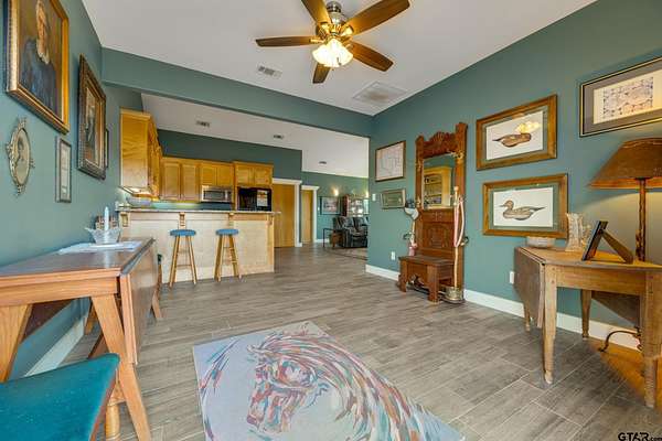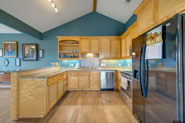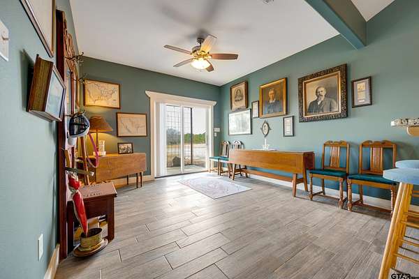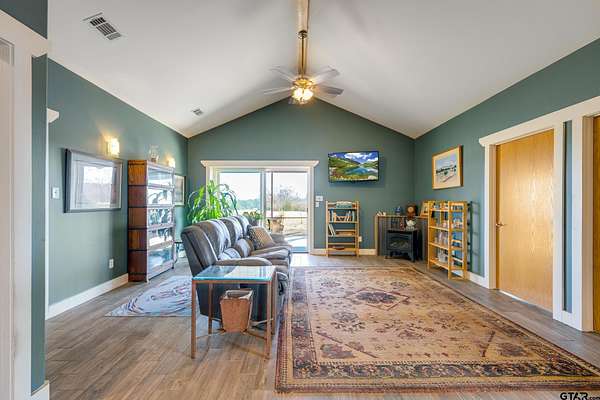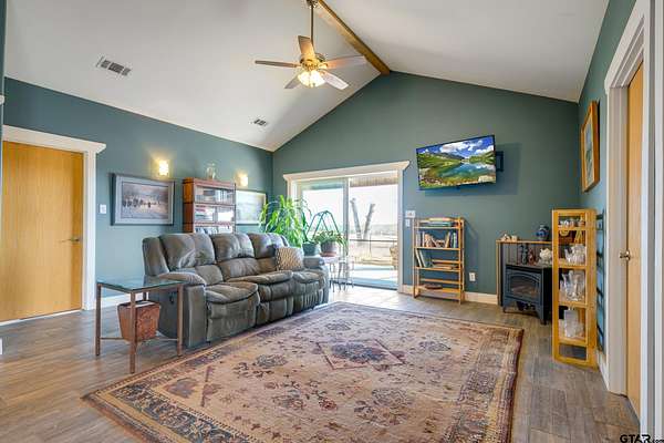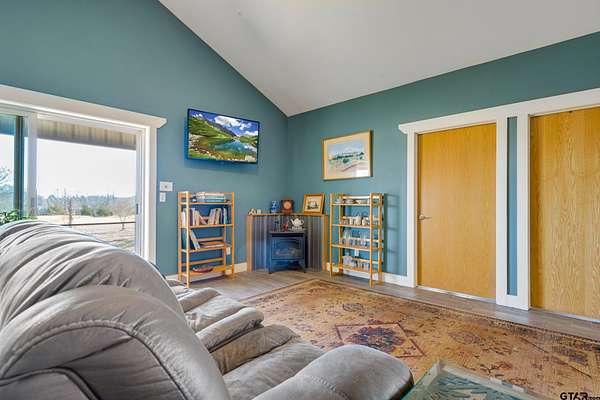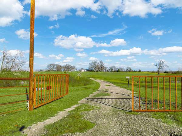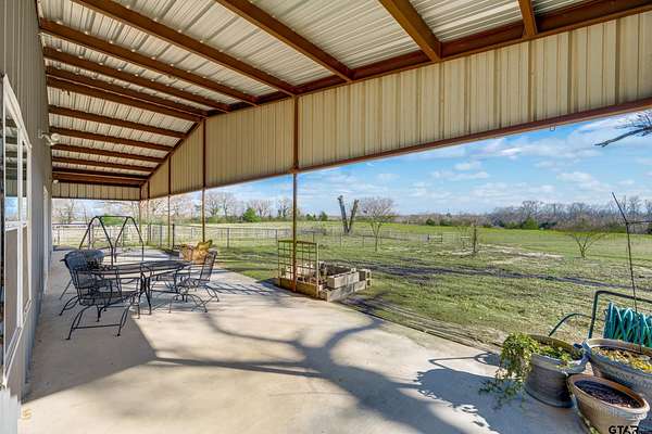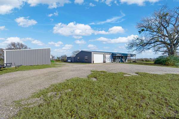 Enjoy peaceful country living in the rolling countryside of East Texas with this charming 2 bedroom, 2 bath barndominium built in 2013 and perfectly positioned on 27.58 acres of beautiful pastureland. Designed for comfort and functionality, this home features inviting covered porches on three sides--ideal for relaxing and taking in the serene views of your land and wildlife. Inside, you'll find wood-look tile flooring throughout and an open-concept layout that seamlessly connects the entry, dining, kitchen, and living areas--perfect for easy living. The home is also equipped with a whole-house water filtration system, providing enhanced water quality and a Generac generator providing peace of mind in all seasons. The spacious primary suite offers private access to the back porch, creating a peaceful retreat overlooking nature. The primary bath includes double sinks, a soaking tub, separate shower, and convenient access to the utility area. The property is well-equipped for livestock and outdoor enjoyment, featuring two picturesque ponds that are great for fishing, 663 feet of road frontage with a solar gate, and an ag exemption currently in place for hay production. Equestrian amenities include a 2,040 sq. ft. stable with four horse stalls and automatic waterers, fenced pasture ready for horses, plus a separate fenced area for dogs. Additional improvements include a 1500 sq. ft. garage plus a two-car carport, offering ample space for vehicles, equipment, and recreational toys. Whether you're seeking a horse property or private country retreat, this exceptional acreage offers endless possibilities in a beautiful rural setting.
