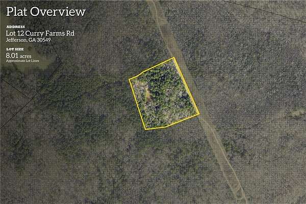This 8.01-acre property is located at Berch Tree Trl in Jefferson, GA 30549. The property is available for sale for $200,250 with a price per acre of $25,000.