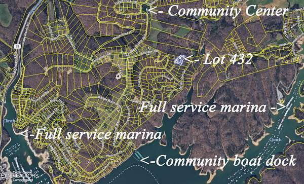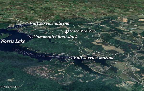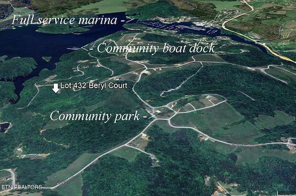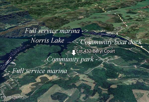 From Knoxville: Take Hwy 33 North thru Halls and Maynardville and cross Veterans Memorial Bridge over Norris Lake continue 4.5 miles (R) at community entrance onto Smoky Quartz. Go approx 1.5 miles (L) Feldspar Rd (L) Silver Trail (L) Beryl Court. Lot 432 on (L) in the cul-de-sac at sign. (GPS use home at 256 Feldspar Rd New Tazewell, TN 37825 but pass home and continue to (L) on Silver Trail (L) Beryl Court to sign on (L) in cul-de-sac)