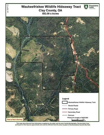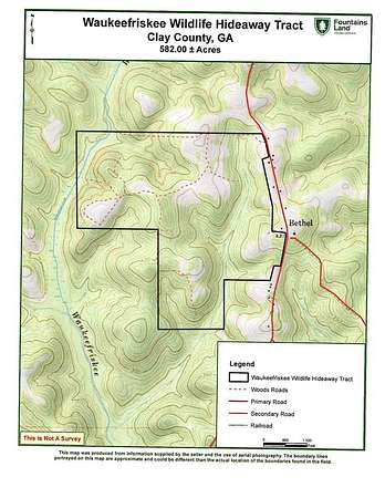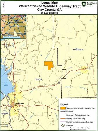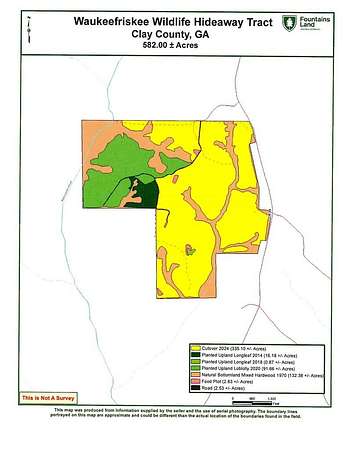 The Waukeefriskee Creek Tract. Located in Clay County Georgia, which is one of the best deer hunting areas in the South. The tract consists of 132 acres of hardwood bottoms, 92 acres of planted loblolly pines planted in 2020, 16 acres of longleaf pines planted in 2014, and 335 acres of fresh clear cut. The clear cut could be cleared for pastures or reforested. There are several streams with pond sites and Waukeefriskee Creek is on the northwest corner of the property. Several established food plots, and a great road system. Electric power runs into the property and county water is available. Over 2000' of road paved road frontage. Beautiful home sites!! Only minutes to Lake Walter F. George. Located near Ft. Gaines, Georgia and a short drive to Eufaula, AL and Dothan, AL. Just 3 hrs from Hartsville-Jackson Airport in Atlanta, GA. This place has it all!!!