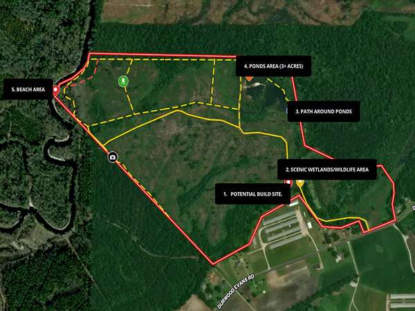 Features: Over 800 ft. of frontage on the Northeast Cape Fear River, 5+ acres of ponds and wetlands that are rich with waterfowl, nearly 3 miles of roads and trails, abundant road frontage, and several potential build sites for a home or hunting cabin!