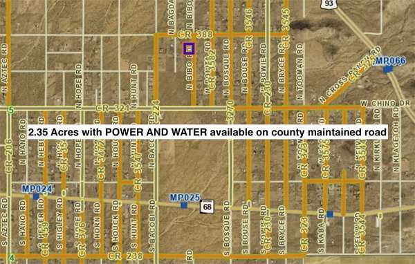 2.35 Acres - Buildable Land with Utilities Available! Discover the perfect opportunity to build your dream home on this 2.35-acre parcel with POWER and WATER available. Conveniently located on county-maintained roads, this property offers easy access to Highway 68, making travel a breeze. Enjoy quick trips to the Colorado River, as well as nearby cities like Kingman and Las Vegas. The lot is outside of any flood zone, giving you added peace of mind, and is ready to be cleared and built on. Whether you're looking to build now or invest for the future, this property offers space, accessibility, and great potential.