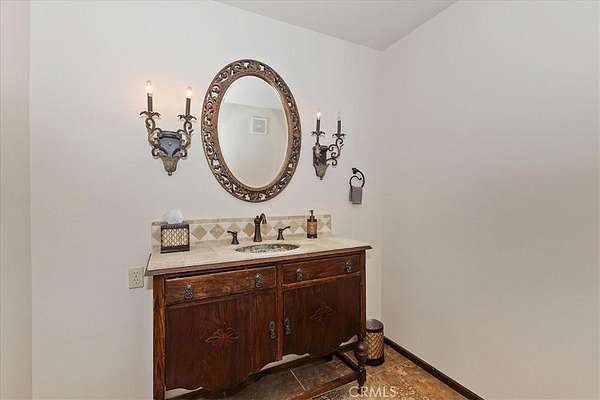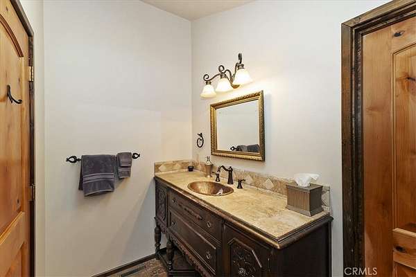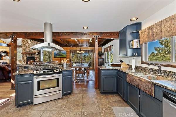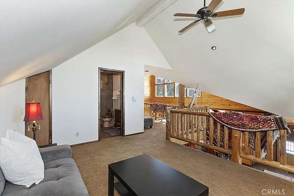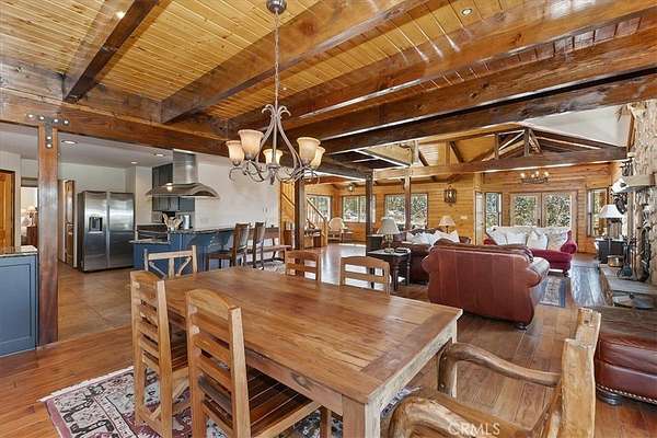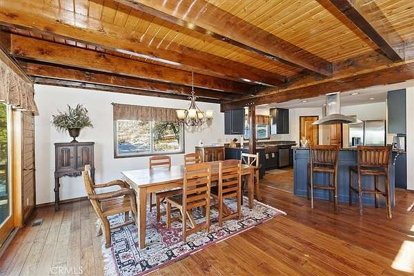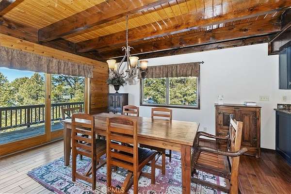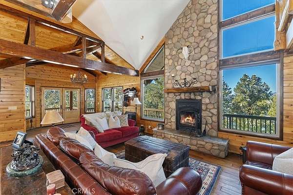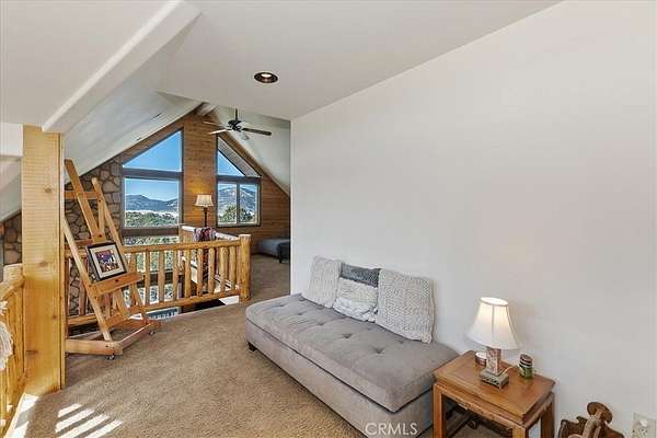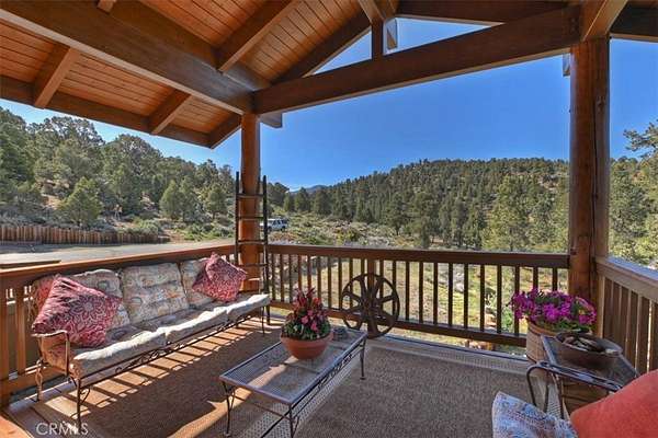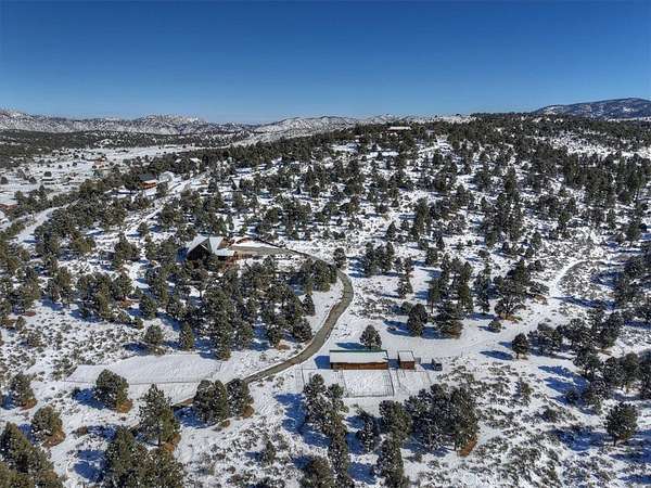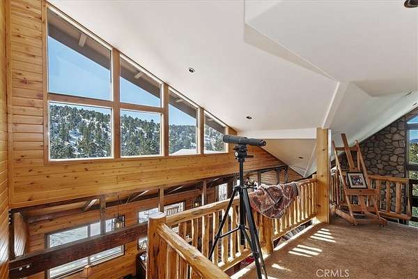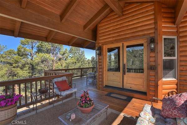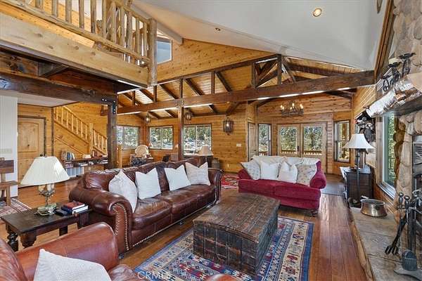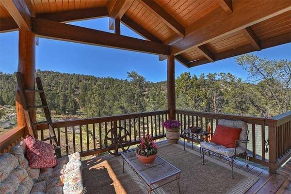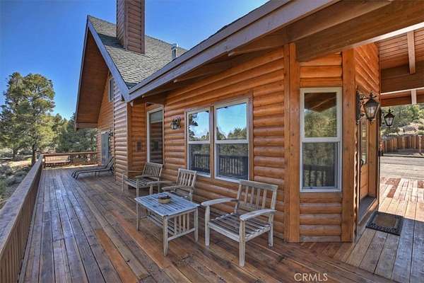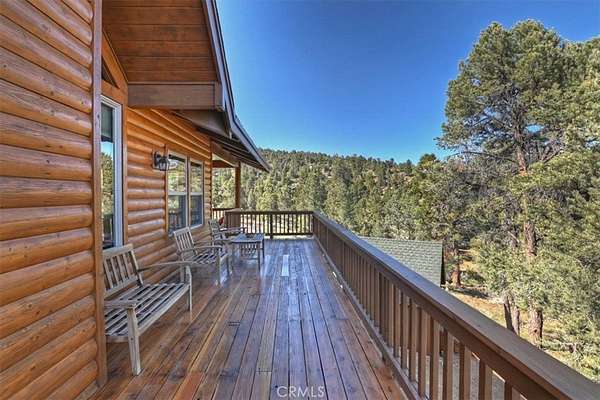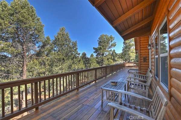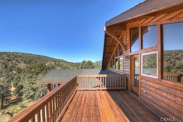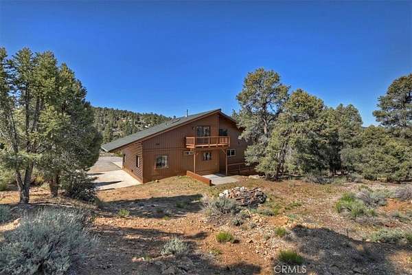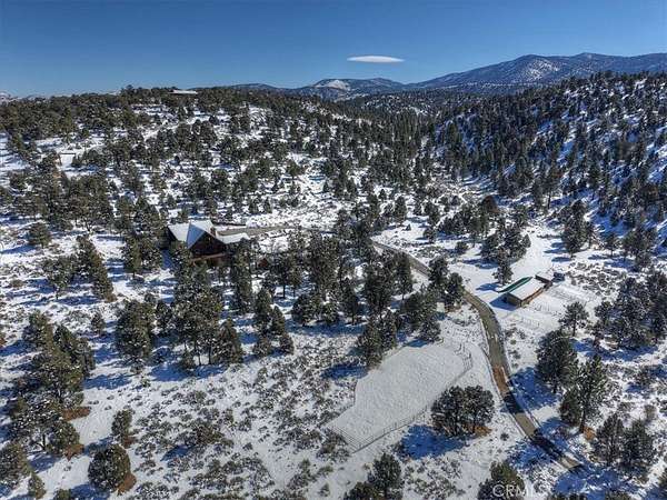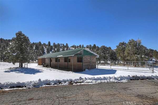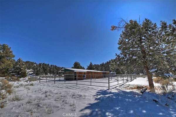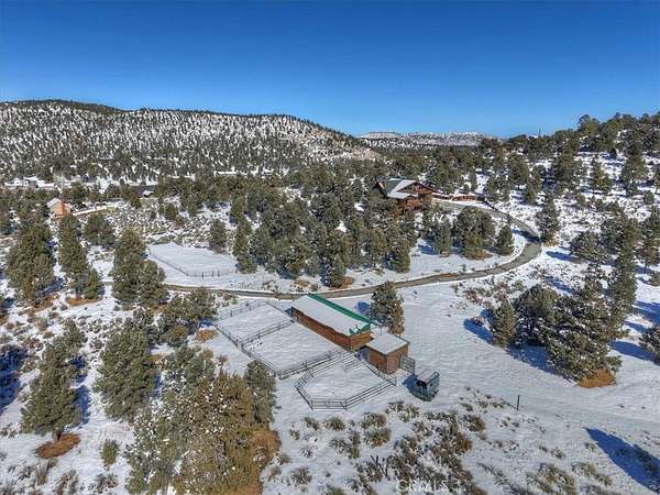 The home also features vaulted ceilings, a three-car attached garage, large redwood decks, and a three-stall barn, each with its own corral, an attached tack room with a half bath, a hay storage shed, a riding arena, and covered RV parking. All of this is set on 10 wooded acres in the middle of a pinion forest, with views of the surrounding hills and Baldwin Valley. The exterior has just been freshly painted and stained. This property is ideal for equestrian use but offers many other uses as well.