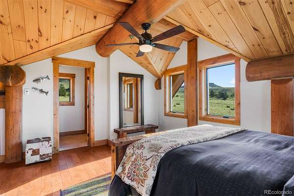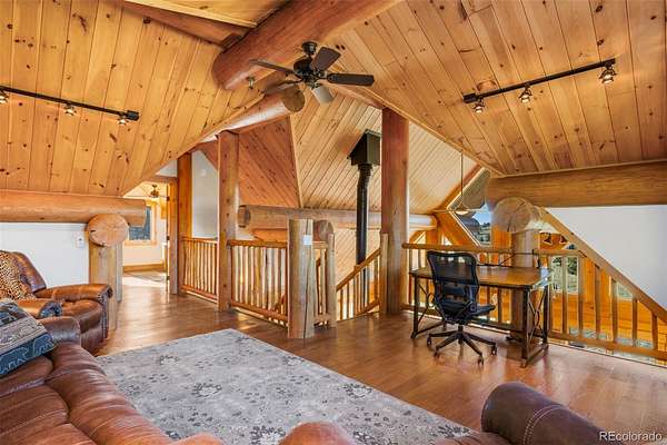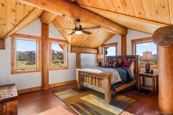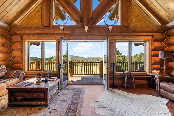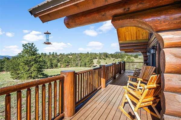 Inspirit Ranch is located in Southeastern Park County near Guffey, Colorado. This exceptional 890 +/- acre hunting and recreational property offers a rare confluence of natural resources—abundant water, fertile grasslands, off-grid living, and diverse wildlife. Nestled among tall Ponderosa pines at the southern base of Thirty-nine Mile Mountain, the ranch sits above 9,000 ft. Nearly one mile of frontage on Hwy 9 provides easy access and connects to an excellent internal road system. The stunning 3,575 sf log and stone lodge is fully off-grid and self-sufficient, with an open floor plan featuring 3 bedrooms, 3.5 bathrooms, a full kitchen, entertainment room, study, mudroom, wraparound porch, and a 3-car garage with ample storage.