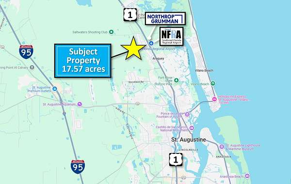 Prime 17+ acre industrial parcel located just west of US-1 in the fast growing North St. Augustine area. This expansive property offers unmatched potential for development, strategically positioned near the St. Augustine Regional Airport and Northrop Grumman Aeronautic Systems. With convenient access to major transportation routes such as US 1 and I-95 its a location within a rapidly growing economic hub. This site is ideal for manufacturing, warehousing, or logistics, this parcel provides an unparalleled opportunity to capitalize on the areas growth. Some civil engineering work has already been done at this property and is available for a review. Seller will provide a $300,000 credit at closing towards the road extension and utilities. Dont miss your chance to secure a premier industrial development site in the heart of North St. Augustine.