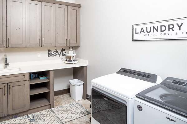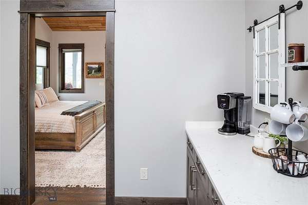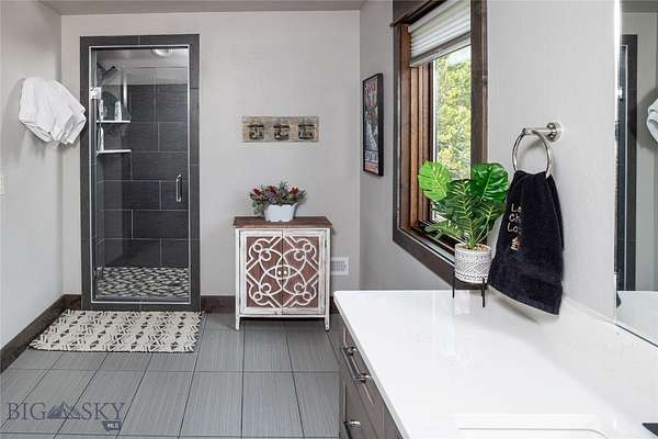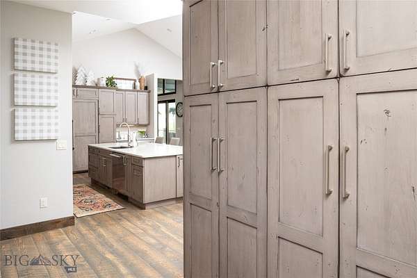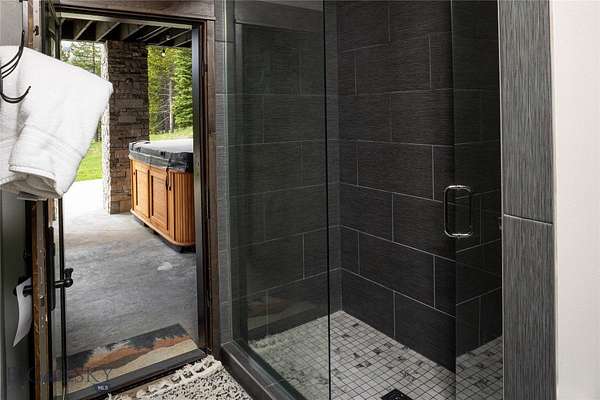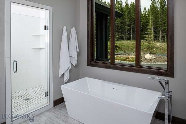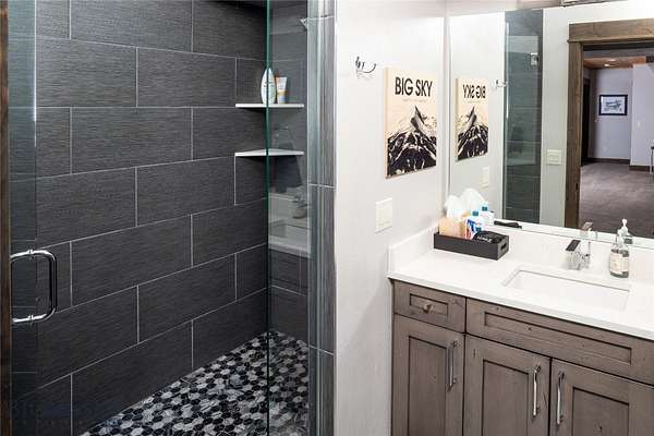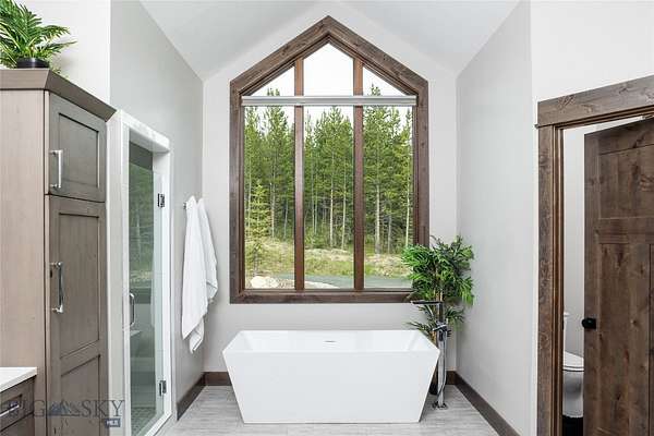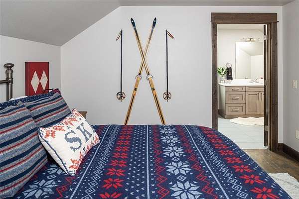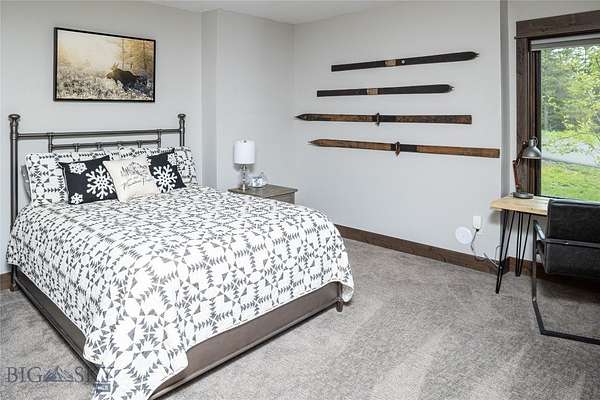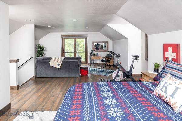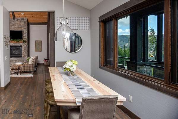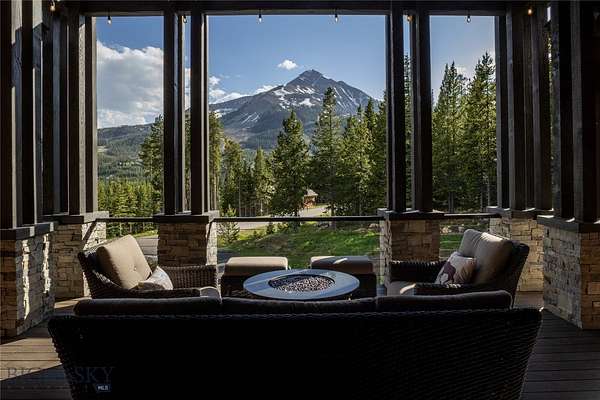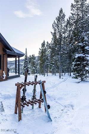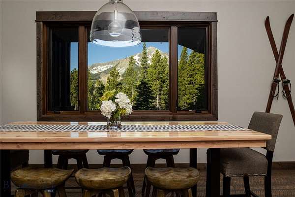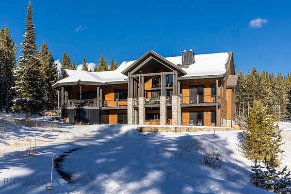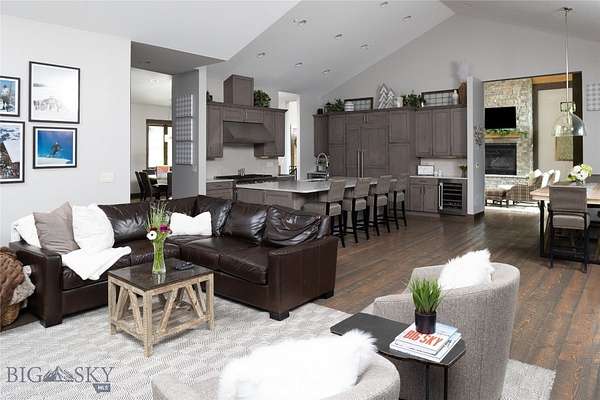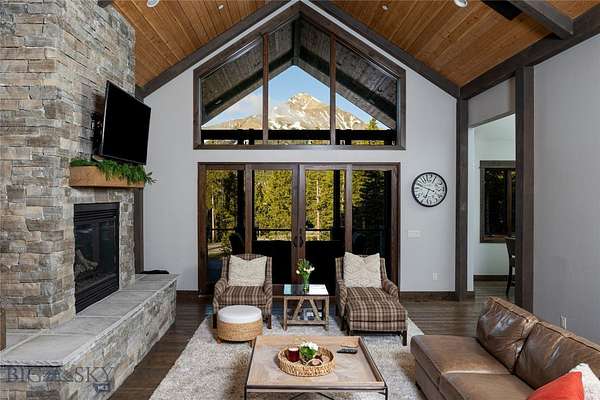 Ski-in, ski-out access, Lone Peak views, and quiet cul-de-sac living come together at this elegant home in the Cascade neighborhood. The vaulted great room brings in natural light and frames the surrounding landscape, while two main-level gathering areas-each anchored by a fireplace-offer comfortable places to unwind after time on the mountain. The chef's kitchen features custom cabinetry, an oversized gas range and hood, panel-front refrigeration, solid surface counters, and an island sized to host, as well as every day use. Outdoor living extends across spacious covered decks and a lower patio with a hot tub, all set among 1.519 wooded acres. The main-floor primary suite sits privately on its own wing, while the bonus suite above the garage provides a generous, quiet space for guests. The lower level adds a rec room, wet bar, bunk room, and two additional bedrooms, with easy walkout access to the patio and ski trail. A dedicated ski room with lockers and a gear dryer keeps equipment organized and ready for the next run. Moments from Big Sky Resort and the emerging One&Only, this home pairs true mountain access with a layout designed for comfortable year-round living.