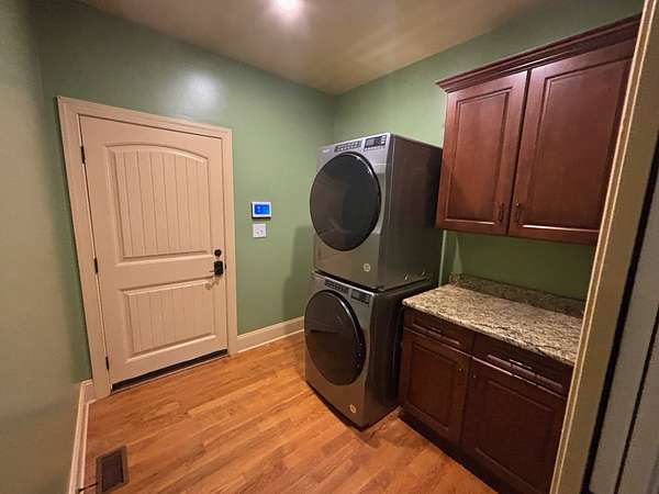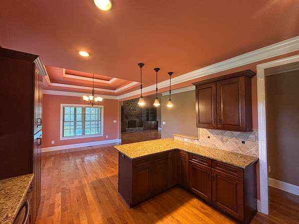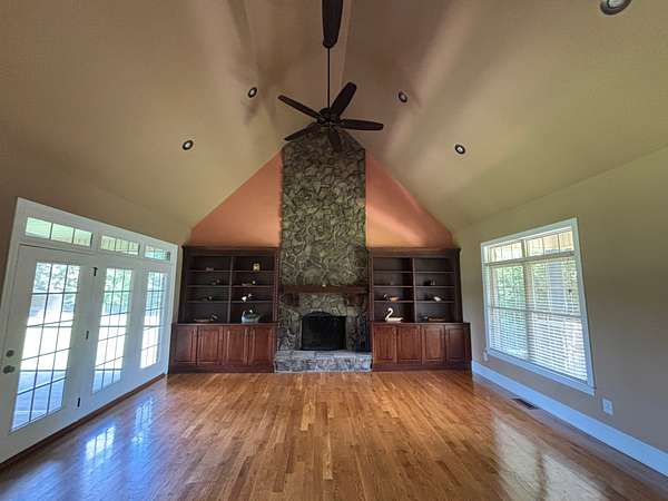The open floor plan features vaulted ceilings in the living room and a full-length stone wood-burning fireplace, creating a warm and inviting atmosphere. The spacious eat-in kitchen is appointed with granite countertops and updated appliances, including an electric range, refrigerator, dishwasher, and microwave. A laundry room with washer and dryer is included. Hardwood floors span the living room, kitchen, and laundry, while tile finishes all bathrooms and carpet enhances the bedrooms. A screened-in back porch and oversized two-car garage add comfort and convenience. The home is also equipped with a generator and 250-gallon propane tank for backup, along with private well and septic.