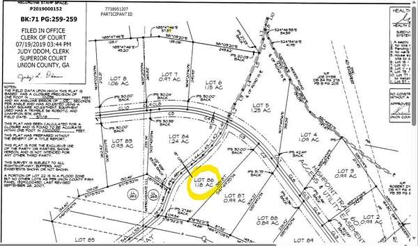 Est $303/moCorner lot located in delightful Highland Park community on the shores of Nottley Lake in Blairsville with lake access! Amazing price for this easy, gentle 1.18 acre lot with potential mountain view in back. Highland Park is gated community w/ terrific amenities including Clubhouse, Workout facility, gorgeous Pool, a movie theatre, outdoor fireplace and Boat slips available for day use all included in HOA fee of under $84/mo. Friendly place with all newer stately homes, paved roads and water & elec installed at the lot. Can help to recommend awesome builders in the area to create your dream home! Seller also offering financing with negotiable terms.
