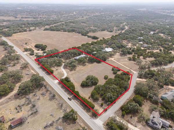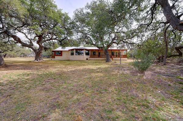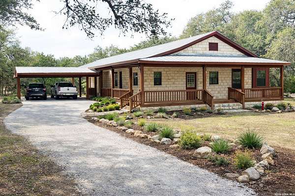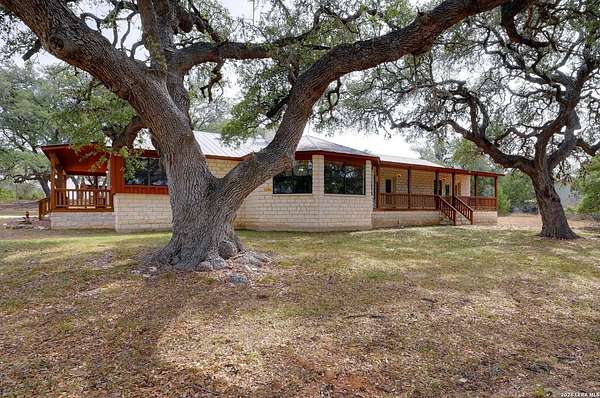 Beautiful custom-built limestone home situated on a private 5.27-acre tract in the heart of the Blanco Hill Country, strategically tucked between 30+ mature Live Oaks. This 2,496sqft well-designed 3-bedroom, 2.5-bath home features an open and spacious layout with an extra-large kitchen, dining, and living area ideal for entertaining and everyday living. The vaulted living room showcases an incredible floor-to-ceiling stone fireplace, creating a warm and inviting centerpiece to the home. The kitchen is designed for both function and storage, featuring a large walk-in pantry and generous workspace for cooking and gathering. An exceptional and rare feature for homes of this age; every bedroom includes its own walk-in closet, with the primary suite offering two separate walk-in closets along with additional walk-in storage in the hall. Mature heritage oak trees are scattered throughout the property, while a large open field offers potential space for an additional shop or future improvements. Perimeter trees have been intentionally preserved to provide privacy and natural buffering from neighboring properties and roadways. Enjoy exceptional west-facing Hill Country views and stunning sunsets from the three-sided covered wraparound porches, which also help shade the home and protect windows from direct sun exposure. The property offers excellent functionality with a detached two-car garage with carport and a three-bay equipment area, providing ample space for vehicles, tools, and recreational equipment. The home is accessed by paved frontage along Ranch Road 165 with additional paved access from county-maintained Rocky River Road. Conveniently located 10 minutes to Blanco, 20 minutes to Wimberley, 25 minutes to Dripping Springs and under an hour to San Antonio and Austin. This one won't last long, book you tour today!
