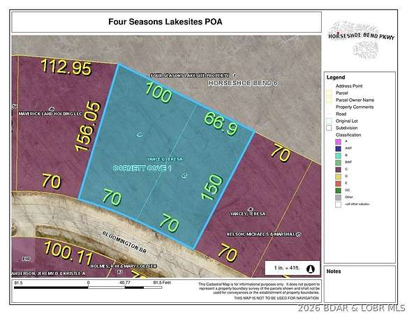 From Horseshoe Bend Parkway (MO-242), turn right onto Cherokee Road. Continue on Cherokee Road, then turn left onto Bloomington Drive. Follow Bloomington Drive and Lots 47 & 48 will be located on the right-hand side. Look for signage.