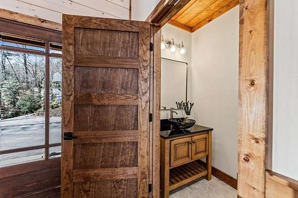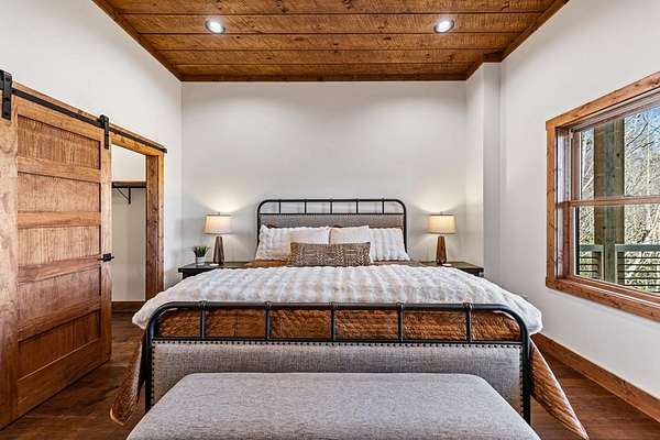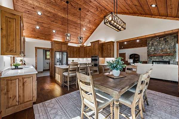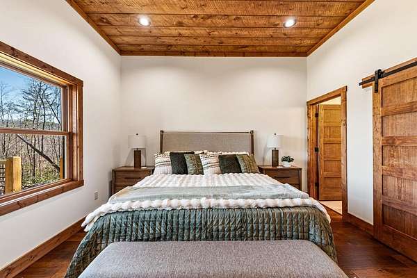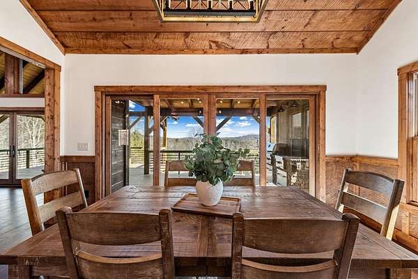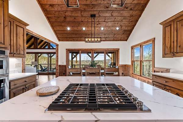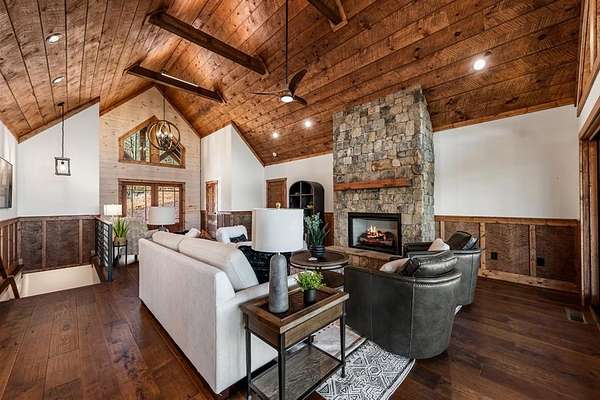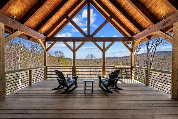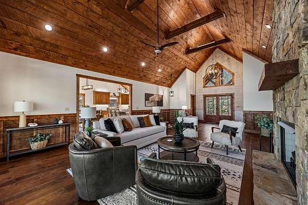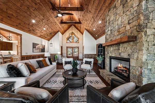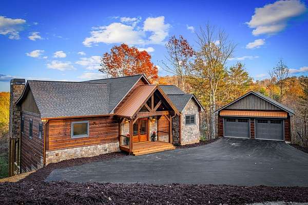 Introducing this stunning newly constructed 3BR/3.5BA home with a two-car garage, perfectly situated to take advantage of the mountain views. Located within the desirable Aska Adventure Area, this home is just 2 miles from downtown Blue Ridge, providing easy access to Lake Blue Ridge, the National Forest, and the Toccoa River for endless outdoor adventures such as hiking and mountain biking. The residence showcases expert craftsmanship, blending high-end and elegantly rustic finishes throughout. The main level features an inviting foyer, a spacious great room with cathedral ceilings and a stone fireplace, and a gourmet kitchen equipped with quartz countertops, custom cabinetry, stainless steel appliances, and a walk-in pantry. The master suite boasts a double vanity, a roll-in custom tile shower, a separate tub, and cathedral ceilings. Additional amenities include a half bath and a true laundry room. The lower level is designed for entertainment with a game room, and a flex room, a second stone fireplace, and a wet bar area, along with two guest bedroom suites. All the closets are spacious. Enjoy the serene exterior space with a covered porch spanning the length of the home with an outdoor kitchen, outdoor fireplace, lower level covered porch, covered entrance porch, steps from upper level around side of home to access a fire pit area, 2 car garage with 240V supply for EV charging/workshop equipment, paved driveway with plenty of parking and turn around room. All located within a coveted gated, paved road community. Ideal for short-term rentals, this home offers both luxury and accessibility in a prime mountain location. Furnishings are included.