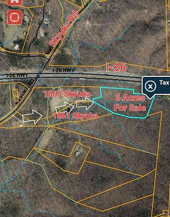 Est $629/mo"Over the River & Through the Woods" to this 5 Unrestricted acres you go! 5 acre parcel sits at the end of a long private driveway that services approx 3 properties. The land is mostly wooded - AND - has meandering creeks running through it! Property is unrestricted, so mobile homes & tiny homes are allowed (consult with County for specific guidelines & approval). Property is adjacent to I-26. Land is located off of Skyuka Rd near 1863 Skyuka Rd.