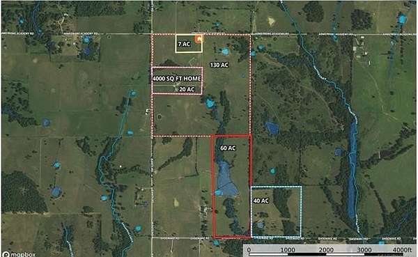 137 Acres of Cattle Land with Ranch Home! Property features Bermuda and native grasses, five fenced and cross fenced pastures for rotational grazing, and four ponds. The property also includes a functional implement shop and functional working cattle corrals. The comfortable ranch home offers 3 bedrooms, 1.5 baths, a cozy wood stove, and a one-car garage, providing comfort after a day on the land. Conveniently located just 2.5 hours from major metroplex areas and a quick 20 minutes from Choctaw Casinos.