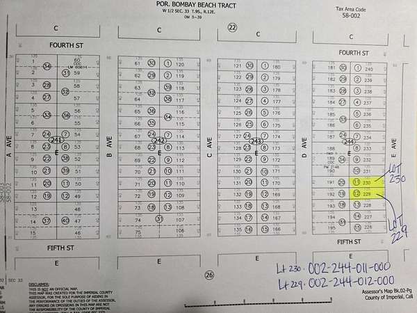 Bombay Beach, Ca. Unimproved Residential Lot 230 on Avenue E. Located Between 4th and 5th Streets. (From 5th Street going North, go approx 180 feet to the North and on the West side you should be at approx middle of Lot 230), You own the land. Utilities are along property lines. Bombay Beach is a popular destination to people from all over the world. Its has Eclectic apocalyptical charm, Artists attractions and Ruins from days gone by. Town often has weekly events in the gorgeous winter months. The popular SKI Inn Bar & Restaurant in town often hosts live music. Events on the beach. Bombay Beach attracts permanent and winter residents, artists, musicians, writers, etc. Here is your chance to get your own spot in this increasingly popular town. Property sold ''AS-IS'' . Seller and/or agent make no warranties. All information deemed reliable however buyer to do their own due diligence / investigations to satisfy themselves. APN: 002-244-011-000. Note: Seller is also selling adjacent lot to the South APN 002-244-012-000 Lot 229 for $24,900.