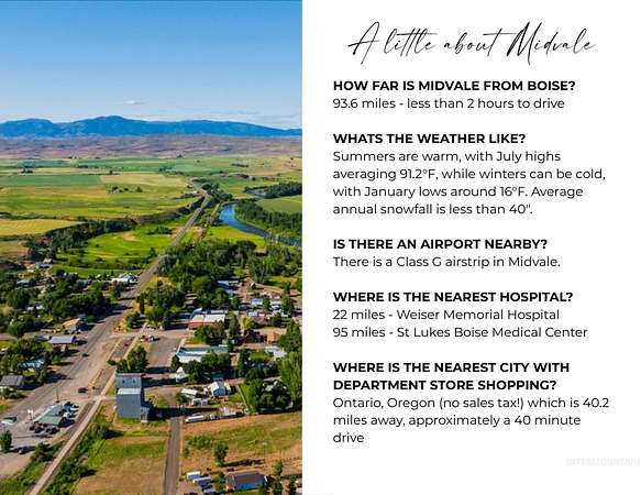 Idaho ranching roots run deep on this productive 80-acre property along the Weiser River, with additional creek frontage from Beaver Creek. Equipped with priority water rights, two three-tower center pivots, three wheel lines, and three Middle Valley Ditch shares, this land offers dependable irrigation for hay, pasture, or row crop production. Currently planted in alfalfa, the field is primed for immediate use. Cross-fenced pastures support livestock, while direct access to the 80+ mile Weiser River Trail opens up opportunities for horseback riding, biking, hiking, and wildlife watching. Located less than a mile from Midvale, with development splits verified through Washington County, this is a rare opportunity to secure irrigated land with both agricultural function and long-term potential.