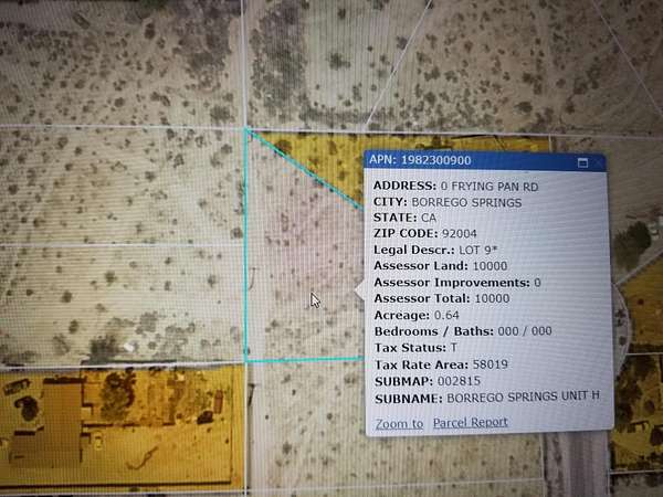Est $215/moBorrego Springs, Ca. Large Residential lot 27,878 sf M/L. Build your dream home located on a cul-de-sac in great area surrounded by nice homes. Gorgeous views of the Mountains to the West. Build your desert winter, vacation or permanent retirement home. Close to center of town. Borrego Springs centrally located close to San Diego, Imperial and Riverside Counties. Borrego Springs area know for its eclectic artist community, shops and restaurants and golf. Power lines running along property line. You own the land. No HOA's. For Barring's google 2902 Frying Pan Rd, Borrego Springs, lot is just to the left.