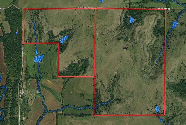 This property is a sportsmen's paradise. Less than 2 hours from Kansas City and not even an hour from Topeka it would be an enjoyable way to escape the city and relax. It boasts award winning trophies, and heavily wooded draws. It is an undisturbed and remote native grassland that would make the perfect setting for an off-grid home or cabin. As you enter the property you are greeted with panoramic views for miles. Despite the picturesque vistas, the property is the epitome of privacy. The quiet nature of this pastureland helps nurture the wildlife. The whitetail deer have not been pressured in this sanctuary for several years. The deep wooded draws provide cover, three ponds supply water, and prime secluded bedding ensure the wildlife flourish. This property is in hunting unit 9. Evidence of deer are plentiful throughout this property, including rubs, scrapes, and trails. A visitor to the property will likely see whitetail and wild turkey moving about. Game cameras set up in November 2023 captured some recent activity. The pinch points and funnels this farm naturally provide gives bow hunters and rifle hunters superb opportunities to claim a nice buck. The topography would be excellent for setting up tree stands on mature trees in the draws or setting yourself up for a lengthy rifle shot. This acreage will please hunters of all kinds. If quiet seclusion is your dream this property would be ideal. In addition to the abundant wildlife, the ponds offer fishing. Add lawn chairs and fishing poles next to the pond furthest west and it would make a lovely, well shaded family gathering spot. The roads surrounding the property are less traveled than most which helps create this peaceful retreat. The wooded draws offer ample fuel for campfires or a wood stove on cold nights. The 356 +/- acres sits on the corner of Water Mill Road and Boxelder Road in Pottawatomie County Kansas. The perimeter is fenced, and although older it has functioned holding in the fifty cow/calf herd that were pastured during the season of 2023. There are two gates into the property. If you are looking for a place to graze your own herd or rental income there are opportunities to lease out pastureland. Two of the three ponds on the property have had new spillways in 2023. This property is situated in the heart of Pottawatomie County (Union & Center twp.). From Laclede Baptist Church it is 1.5 miles west, 1 mile south & 1 mile west.