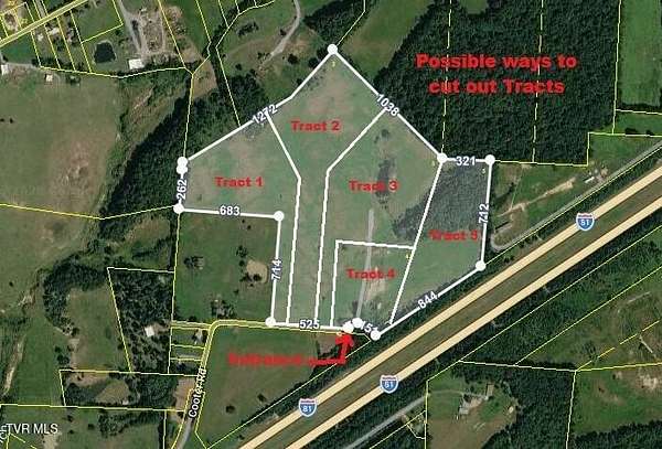 52 Acres with Mountain Views, Pond, Privacy & Prime Frontage - Greeneville, TN. Discover the perfect blend of privacy, productivity, and potential with this exceptional 52-acre property located at the end of Braketree Lane in beautiful Greeneville, Tennessee. Offering breathtaking mountain views and peaceful seclusion, this versatile tract is ideal for a private estate, family compound, farm, or future development. The land features a mix of cleared level fields and gently rolling meadows, currently producing large hay yields, making it both scenic and income-producing. A large pond enhances the property's natural beauty and provides excellent recreational opportunities. With over 800 feet of frontage on Interstate 81 and approximately 525 feet of road frontage on Braketree Lane/Cooter Road, the property offers easy access and outstanding visibility while still maintaining privacy at the end of the road. The entrance is wide and easily accessible for equipment, livestock, or future development. Utilities are already in place with public water and septic, adding significant value and convenience for immediate use or future building. Multiple prime building sites throughout the property offer stunning mountain views and flexible options for home placement. Whether you're looking to build your dream home, create a working farm, develop multiple tracts, or invest in East Tennessee land, this property delivers exceptional opportunity. See pictures for suggested ways to divide the property into tracts. Rare opportunity to own a large, versatile acreage tract in a highly desirable location with unmatched views and accessibility. Part or all of the information in this listing may have been obtained from a 3rd party and/or tax records and must be verified before assuming accurate. Buyer(s) must verify all information.