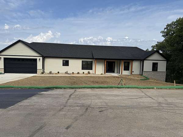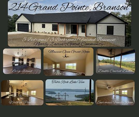 Ready for Table Rock Lake life in this Brand NEW HOME Introducing the Grandview Junction Finished Basement Floorplan--a showcase of refined elegance and modern comfort, offering over 3,500 sq. ft. of luxurious living with panoramic views of Table Rock Lake. Perfectly positioned in one of the area's most desirable locations, this home blends impeccable design with breathtaking scenery.Upper Level Highlights:Open-Concept Living: Vaulted ceilings in the living, dining, and kitchen areas create an airy, inviting atmosphere.Designer Kitchen: A statement-making 10-foot island with breakfast bar, granite countertops, and a built-in pantry makes this kitchen both beautiful and functional.Owner's Suite: Retreat to a spacious master bedroom with walk-in closet and an en suite bath featuring a marble shower with sliding glass doors--a true spa-like escape.Second Bedroom: Perfect for guests or as a versatile flex space.Flooring: Click Lock vinyl plank flooring throughout (excluding stairs) for style and durability.Finished Basement Features:Spacious Family Room: Ideal for entertaining, game nights, or cozy movie evenings.Private Office: Perfect for remote work or creative pursuits.Three Additional Bedrooms: Bedrooms 4 & 5 feature walk-in closets. Added bonus of an office on the basement level!!Full Bath: Conveniently serves the lower level.Exterior & Outdoor Living:LP Smart Siding with stained fir gable trusses for a rustic-meets-modern curb appeal.Dual Decks on both levels to soak in the stunning lake views.Welcoming Covered Porch for morning coffee or sunset relaxation.Additional Highlights:Two-Car Garage with ample storage space.Close to shopping, dining, and Branson's top attractions.This home is the perfect harmony of luxury, tranquility, and convenience--an ideal retreat where modern amenities meet natural beauty. Secure your showing today and make this lakeside dream yours!