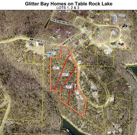 From the intersection of Business 13 and Talking Rocks Rd in Branson West follow Talking Rocks Rd about 4 miles to Waterfield Dr and turn left. Follow Waterfield to Canada Dr and the entrance to Lake Forest Hills for lot 1 of Glitter Bay Homes located on the right from Canada Dr and across from entrance to Lake Forest Hills.