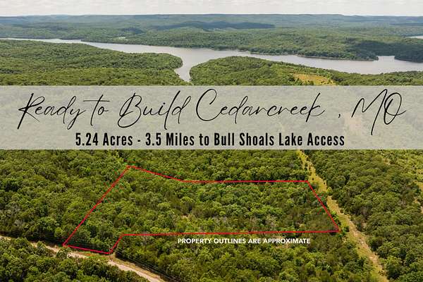 Your Ozark Dream Starts Here...Discover 5.24 acres of prime, build-ready ground tucked into the rolling hills of Cedarcreek, Missouri. With electric at the road, a favorable soil test, and a gentle grade ideal for your dream home. Just 3.5 miles from a Bull Shoals Lake boat ramp, it's the perfect basecamp for anglers, homesteaders, and off-grid seekers alike; not to mention Lake Taneycomo, Table Rock Lake, and Norfolk Lake are all less than an hour away as well. The county seat of Forsyth, with shopping, medical & dining, is scenic 20 miles in, and another 12 miles has you at the ever-popular Branson Landing. Bring your plans and make it yours! OWNER FINANCING AVAILABLE!!