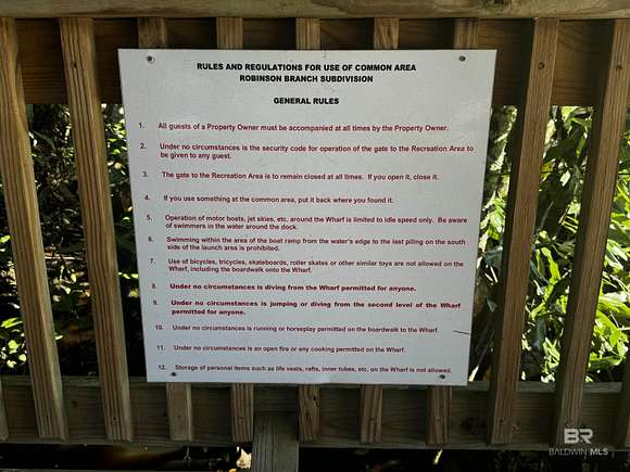 Head west on CR 32 from Hwy 59 in Summerdale. Just east of the Fish River Bridge, take a left on Etta Smith Road into the Robinson Branch Subdivision. Take a left on Bridgeport Drive and towards the end of the cul-de-sac the lot will be on the right. The neighborhood boat launch and pier house and other amenities will be on the right as you drive on Etta Smith Road, prior to reaching Bridgeport Drive.