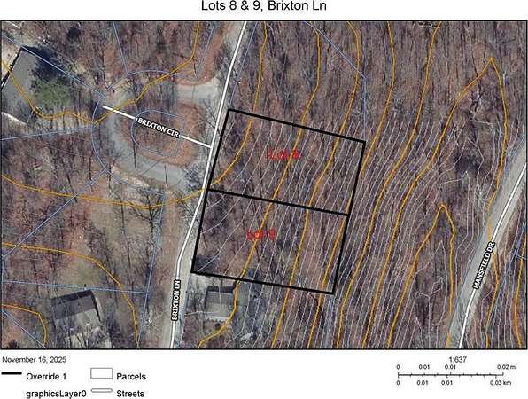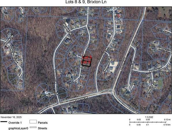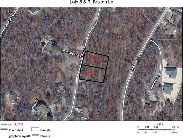 From I-49, Take the Hwy 71 exit into Bella Vista and go north on Hwy 71. Turn right on W McNelly Rd (Benton Co 40). Left on Spanker Rd (becomes Dartmoor Rd). Left on Euston Rd. Left on Manchester Dr. Right on Dorking Ln. Right on Brixton Ln. Lots are on the left. GPS coordinates are 36.449377, -94.216133 (Lot 8) and 36.449148, -94.216187 (Lot 9).