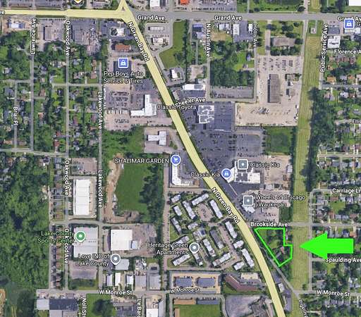 Prime 1.52-Acre Corner Development Site | N Green Bay Rd & Brookside Ave - Waukegan, IL High-visibility development opportunity on the corner of N Green Bay Rd (Route 131) and Brookside Ave, with over 394 feet of frontage on Green Bay Rd and 300 feet along Brookside. The property sits just off Green Bay with a slip road (Pigeon Ave) providing added access. Currently improved with a small house and auxiliary building (potentially demoed or repurposed), the parcel is fully served by utilities to site and zoned B-3 General Commercial, allowing a wide range of uses. Positioned directly within Waukegan's established auto dealership corridor - neighbors include Kia, Toyota, and several other national brands - as well as Pep Boys and Thorntons gas station. Proximity to Grand Ave (Route 132) strengthens exposure and accessibility, with 25,600 average daily vehicles on Green Bay Rd. Ideal for: auto dealership, QSR, retail, service, medical, or mixed commercial development.