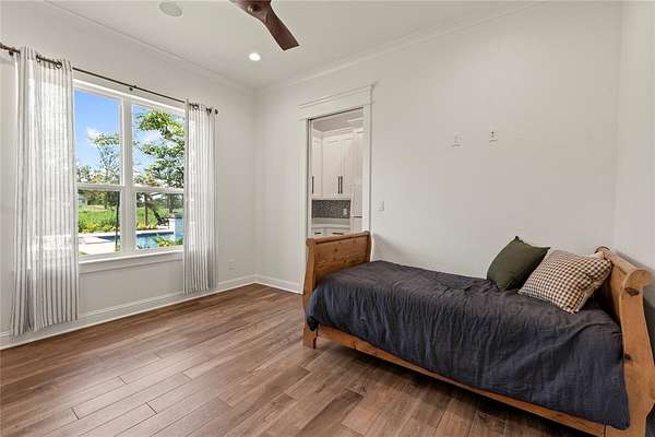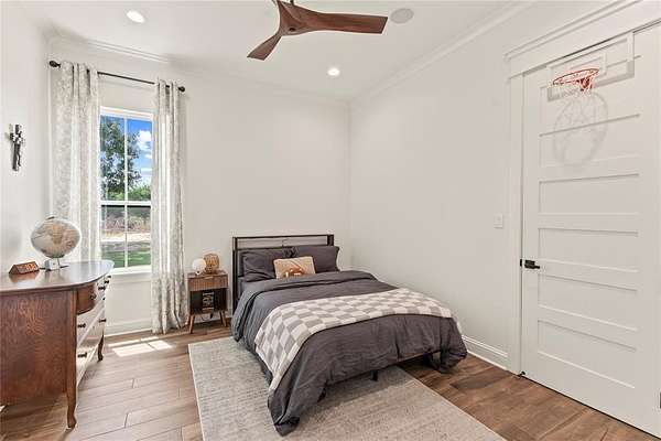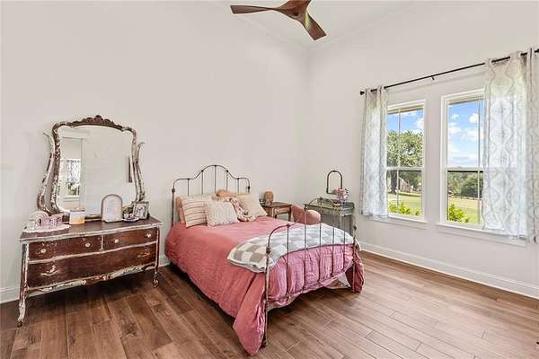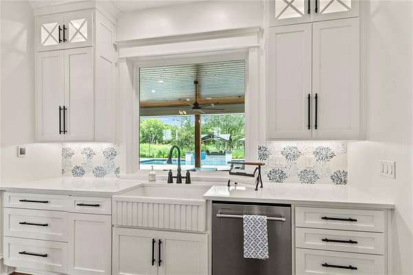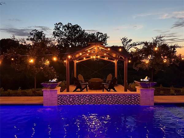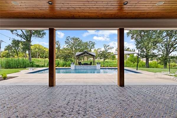 Highspeed internet and city utility convenience meets solitude in this Brownsboro estate, on 8 sprawling acres. Designed by Janey Angelo, cathedral-style architecture floods the interiors with soft natural light. Home features 4 beds, 3.5 baths, a mother-in-law suite, and an upstairs loft overlooking large game room. The master wing offers a bedroom with ensuite, walk-in closet, personal gym, and a private back entrance. The kitchen dazzles with custom features, double ovens, 6 burner gas stove, built in ice maker, walk in pantry, enormous granite island, and farmhouse sink overlooking the pool and pastures. Luxe upgrades include solid wood doors, built in cabinets and storage, surround sound, and a whole-home generator. Outside, an oversized covered patio leads to a heated pool, spa, and gazebo. The grounds include a pond, pastures, circle drive, a 3-car garage, EV charger, and a pole barn. Luxury extras like up-lighting, landscaping, and a stone gate entrance enhance its grandeur.