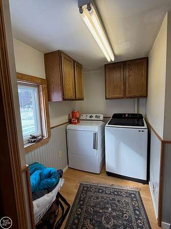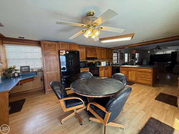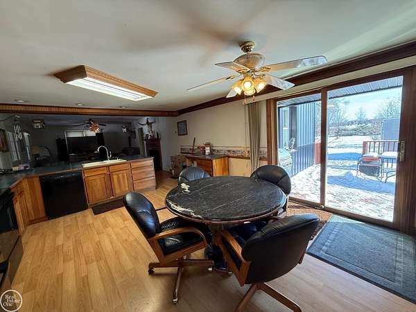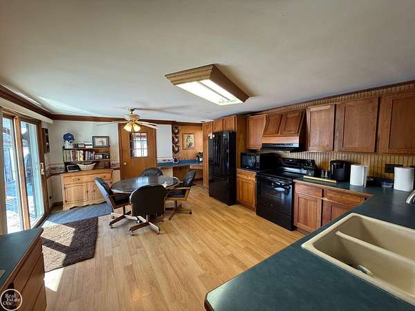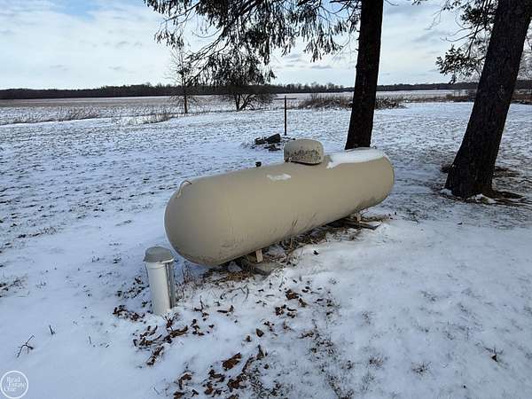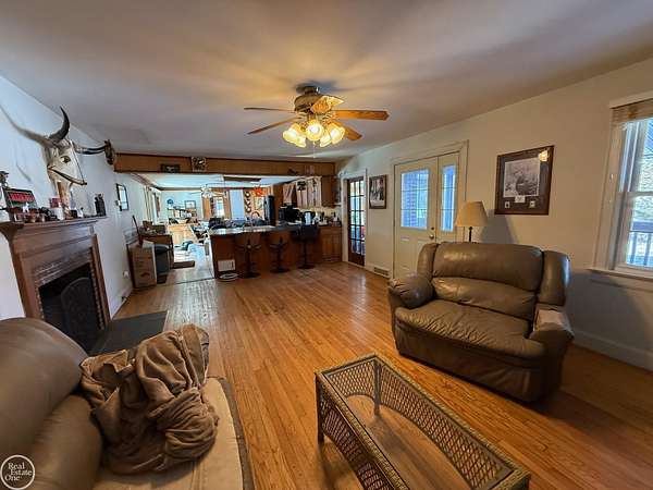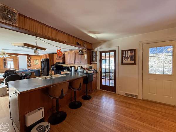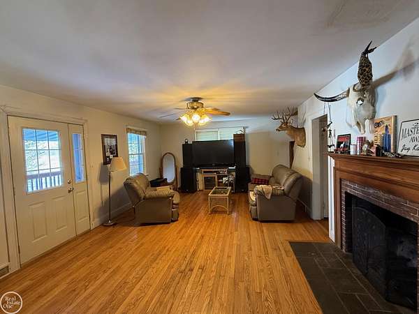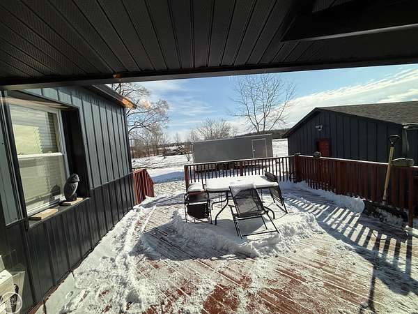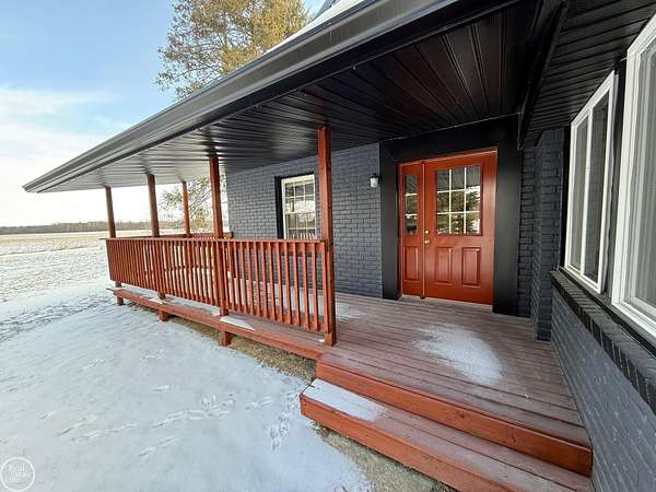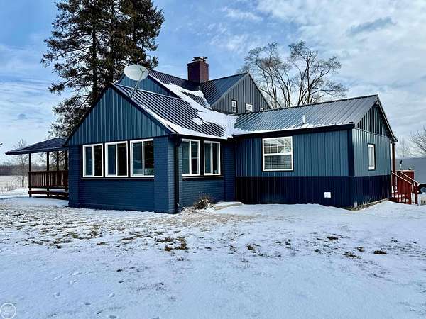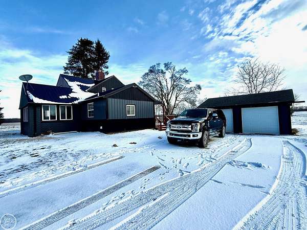 ESTATE SALE!! Rare 5 acre parcel with a 4 bedroom farm house. Exterior of the entire home & garage is all done in metal vertical siding with matching metal roof on both home and garage as well. Great curb appeal with covered front porch w/wooden deck & railings. Rear of home has private matching deck & railing looking out over the 5 acre parcel, vinyl windows, hardwood floors, 2 ceramic baths (1 up and 1 down), open living room w/natural fireplace, maple style kitchen cabinets with peninsula snackbar, 1st floor laundry in side mudroom, 3 season sunroom off the front of the home, 2 bedrooms down and 2 bedrooms up, one large bedroom up has a full bath and large walk-in closet, block basement w/direct access to outside off the rear of the home, copper plumbing, propane forced air furnace, A/C, home needs some TLC, fireplace in the basement, detached 2 car garage that's heated, immediate occupancy, Armada Schools, all appliances to stay.
