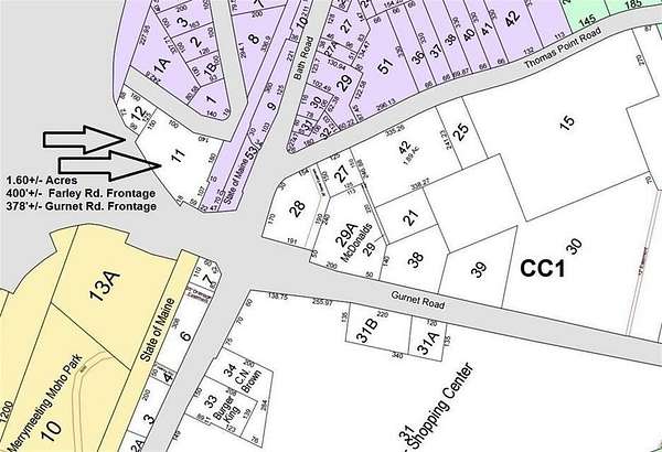 Developers take notice of these 2 Lots for sale in the hub of Cook's Corner. Seller concessions being offered. Located in a qualified opportunity zone. Level and open lot with a huge stand still traffic exposure and visibility from the cooks corner on/ off ramp for rt1. Lot 11 is paved with a 3-bay garage and Lot 12 is gravel with an old storage structure. Frontage on Farley Road and runs alongside the ramp leaving Cooks Corner headed toward Bath. Mixed use and commercial with a wide variety of allowed uses. Assisted living or 55 plus community, Multi Unit Housing, indoor or outdoor storage, Day Care, Hotel, Restaurant, Power sports sales, Medical/dental/vet office, Art Gallery, Solar activities and more. Lots of sun exposure and 3 phase power lines available. Town sewer at the curb and town water is available (call for details). Zero building set backs on all sides but rear. Rear set back 15 ft. 80% impervious lot coverage allowed; 60 ft max structure height. Large foundation footprints allowed-see attached LD 2003-allowing for 60 residential units.