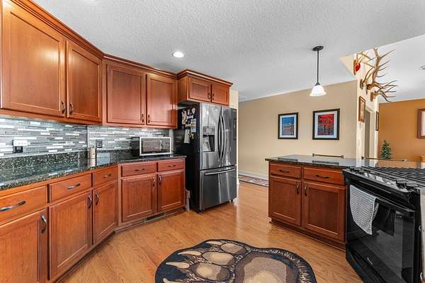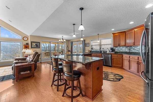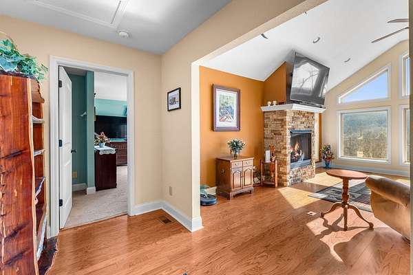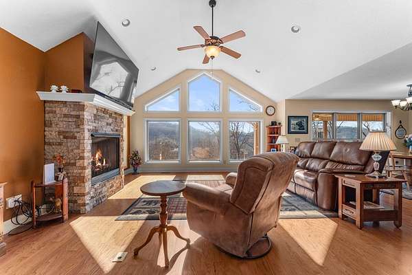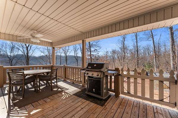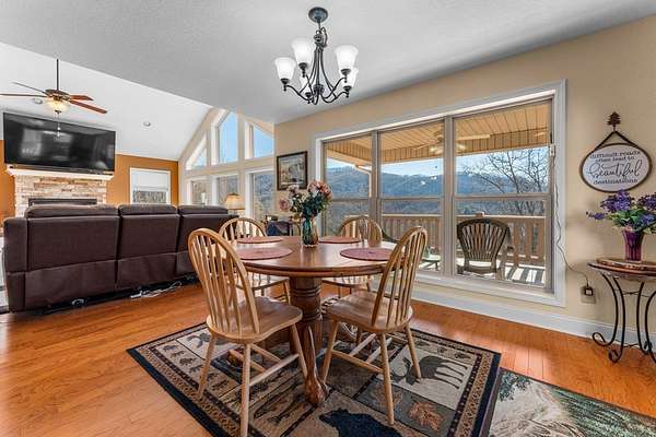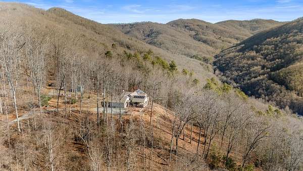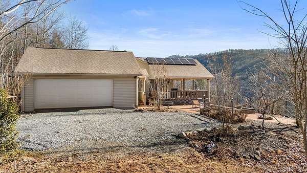 This 3.65-acre mountain retreat offers sweeping 180-degree Smoky Mountain views in the private community of Mountainview at Brush Creek. The custom-built, furnished home features 3 bedrooms & 2 bathrooms with thoughtful landscaping, including raised garden beds, fruit trees & native plants. Energy efficiency shines with 21 solar panels & high-efficiency batteries, allowing optional off-grid living & average electric bills around $20 per month. Inside, the open floor plan features abundant natural light, a cozy fireplace & a flexible sitting nook ideal for a home office or reading space. The kitchen offers cherry wood cabinetry with LED lighting, granite countertops & a large island with range, opening to a dining area & covered deck at a cool 2,800-foot elevation. The primary suite includes an ensuite bath with double vanity, soaking tub & walk-in shower. Outdoor highlights include a fenced backyard, outbuilding for storage & an attached two-car garage. Located minutes from downtown Bryson City, this home offers easy access to dining, shopping & endless outdoor adventure.
