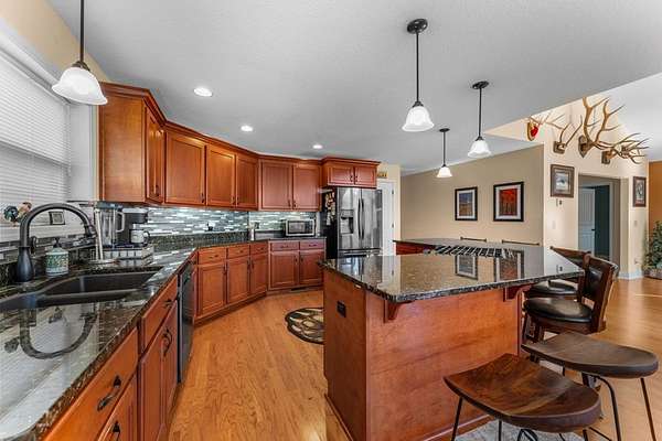 - Breakfast Bar, Ceiling Fans, Island, Kitchen/Dining Room, Living/Dining Room, Main Level Living, Open Floor Plan, Pantry, Primary On Main Level, Walk-In Closets