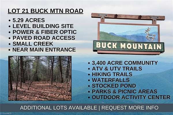5.29 acre building lot w/creek - Conveniently located in 3,400 acre Buck Mountain...ONLY GATED ATV COMMUNITY in Wilkes County. Lot 21 is EASILY ACCESSIBLE on PAVED ROADS. Build your weekend getaway or vacation rental here & enjoy MTN VIEWS. Southwest facing for beautiful sunsets. FIBER OPTIC available. ELECTRIC at lot. Gently sloping terrain is great for building. Long & short-term rentals allowed. Travel Times: Winston-1 hr, Charlotte-1 hr 40 min, Raleigh-2 hrs 45 min. Centrally located 35 min from Boone, West Jefferson & Wilkesboro. Close to BLUE RIDGE PKWY, ASU, shopping, dining, golf, mtn biking & skiing. BUCK MTN HAS HARD TO FIND AMENITIES like ATV & Hiking Trails, Parks, Fishing Pond, Water Falls, Pavilions, Community Center, Helipad, Outdoor Activity Center w/stage for live music. Make lasting memories while hiking or riding ATVs on the miles of trails. YOU WON'T BELIEVE ALL THIS COMMUNITY HAS TO OFFER! 1,400 SF min to build. NO TINY HOMES. NO MOBILE HOMES. NO SELLER FINANCING.