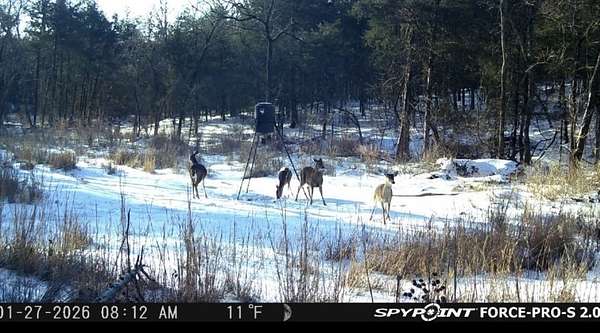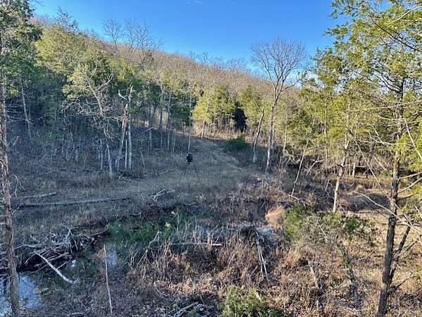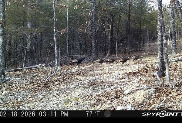 The land features mature hardwood timber, rolling Ozark terrain, and natural cover, creating excellent habitat for whitetail deer and wild turkey. Trail camera photos confirm strong deer movement, and turkey sightings have been documented on the property.