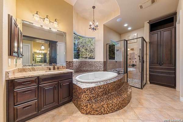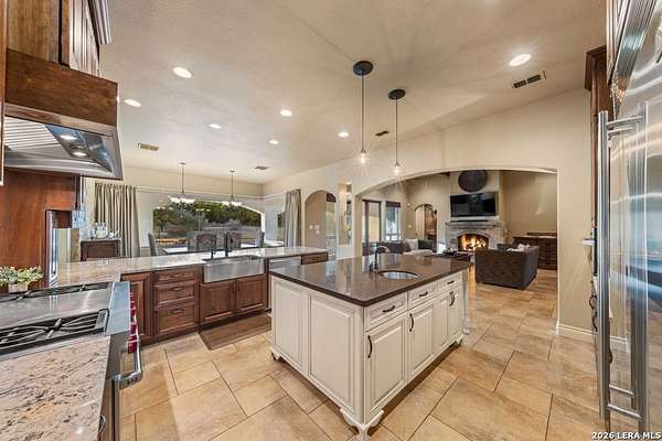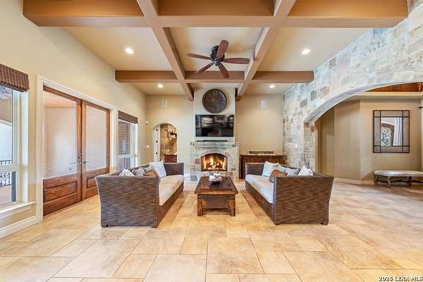 Hill Country elegance welcomes you home at 29745 Ancestral Trail, a secluded retreat in the gated Castle Rock community just off Highway 281. Set on five acres with a barn and Keith Zars pool, this luxurious single-story home features a striking rock exterior and expansive living spaces that blend Hill Country warmth with refined sophistication. The home offers a chef's kitchen, formal dining area, study, five bedrooms, six bathrooms, laundry room, and two living areas-each anchored by a rock fireplace. A grand foyer with stone accent walls leads into an open family room filled with natural light and views of the pool, open skies, and Texas wildlife. The kitchen is the heart of the home, featuring rich wood cabinetry, a large center island, a Wolf gas range with dual ovens, pot-filler faucet, built-in Northland refrigerator, and ample workspace. The secondary living room with a bar and fireplace provides the ideal space for a game room or media lounge. Escape to the primary suite with a spa-like bath, dual walk-in closets, soaking tub, and separate shower. Secondary bedrooms are generously sized with dedicated baths, while a thoughtfully placed guest bathroom enhances hosting ease. Storage and functionality abound with an attached three-car garage tall enough for a lift with built-in shelving, plus a two-car detached garage ideal for hobbies or additional vehicles. Outdoors, enjoy a private backyard oasis with a covered patio, full outdoor kitchen, fireplace, and resort-style Keith Zars pool-perfect for entertaining or relaxing in Hill Country serenity. The barn and acreage accommodate animal lovers, with horses, goats and cattle permitted by the HOA. Luxury, comfort, and Hill Country serenity await-schedule your private showing today.