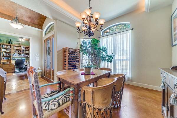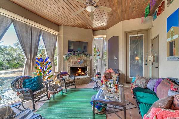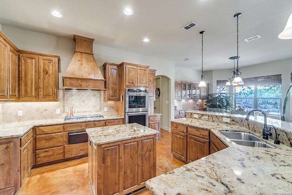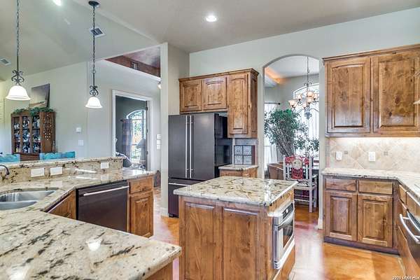 Here's your chance at true Hill Country living in a well-appointed home on over 3 acres in the heart of Bulverde. Nestled in the back of Comal Trace in The Heights with one way in and out, the property is conveniently located near shopping and highway access while maintaining the secluded lifestyle Texans love. Inside, you'll find nearly 3,000 square feet of cozy, flexible, and functional living space: perfect for entertaining large groups, working from home, or just relaxing. The living room charms with a fireplace, custom built-ins, windows looking out into the backyard, and an attached office with more custom built-ins. Located between the formal dining room and the breakfast room, the kitchen is ready for your culinary endeavors with a JennAir warming drawer, KitchenAid gas cook top and double ovens, a shrouded vent hood, a pull-out microwave, and tons of counter and cabinet space. The oversized primary suite sits on one end of the home and features exterior access, tray ceiling, and an expansive bathroom with a separate tub and shower, double vanity, and a meandering closet with built-in storage. On the other end of the house are three more bedrooms, two are guest suites connected by a Jack-and-Jill bathroom, while the third is larger and would also make a great media room or art studio. The three-car expanded garage features a large, partially floored attic for all your storage needs. Outside, you'll find huge oak trees, a covered patio with an outdoor fireplace, and an uncovered patio space. Beyond the tree line, you'll find a seasonal creek that attracts wild turkeys, white-tailed deer, and red foxes. The HOA park is just down the street, so be sure to drive by after your showing. Don't miss this one!