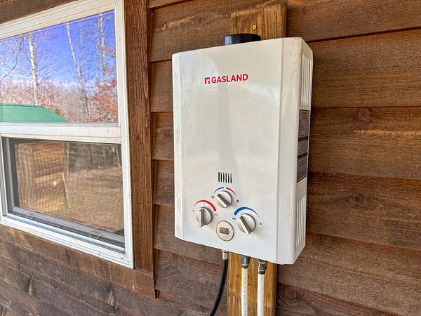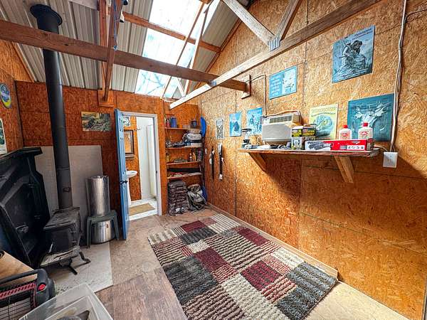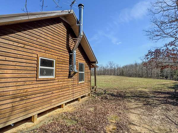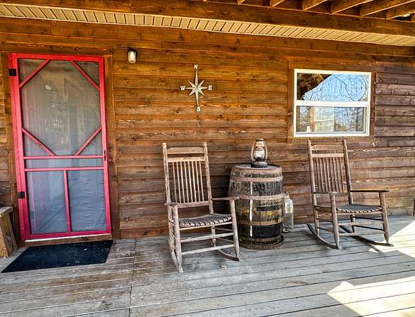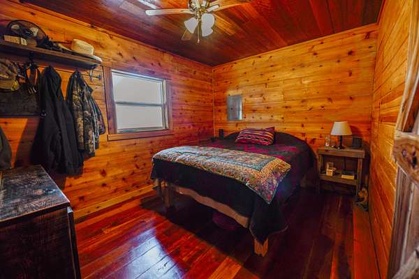 A white cedar cabin sits within an approximately 1.5 acre open field. It is powered by 2400 watt solar panels and supported by a well and septic system. The cabin includes two bedrooms, a loft, full kitchen, and wood stove for year round use. Two covered porches overlook the surrounding field and timber.