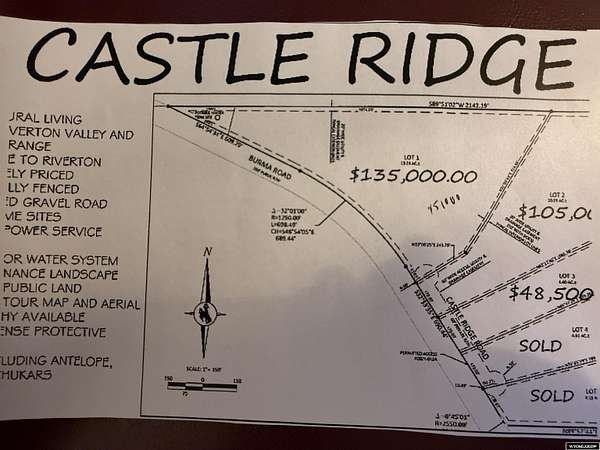 Est $354/moNew Castle Ridge subdivision on Burma Road just a 5 mile drive to Riverton. Well drained gravel road and graded homesites. New electrical power added. Low maintenance landscaping. Protective covenants allow flexibility in the home type and size. Well data indicated successful wells can be drilled between 300' and 400'. Plat plans to allow for developing of a community water system. The panoramic views ae fabulous. Named for it's castle like formations and borders Bureau of Reclamation land to the north and Wind Rivers land to the east. Call Cathy Herron at 307-851-1880 or Doug Stanbury at 307-851-9001.