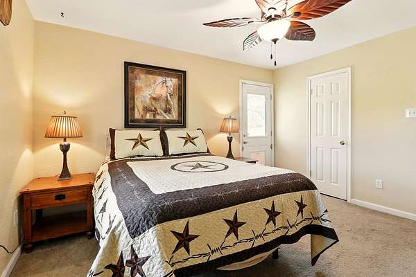 Welcome to 115 Saddle Horn Drive, a beautifully updated 3-bedroom, 2-bath brick home nestled on nearly 2 serene acres in the desirable Cassie subdivision-just moments from the sparkling shores of Lake Buchanan. Surrounded by mature Spanish Oaks, Mesquite, and Juniper trees, this property offers peaceful seclusion with convenient access to the best of the Texas Hill Country. Step inside to find a warm and inviting interior featuring striking Acacia wood floors throughout the main living areas and vaulted ceilings that enhance the spaciousness of the family room. A stunning brick fireplace is a focal point. The kitchen is a true chef's delight with pecan wood cabinetry, sleek black granite countertops, and stainless steel appliances including a glass cooktop, built-in ovens, and a modern exhaust hood. Italian stone tile flooring and a custom-built pantry add both elegance and function. The formal dining room, complete with picture windows and updated lighting, is perfect for entertaining or casual family meals. Retreat to the private owner's suite with a completely renovated bath showcasing a custom walk-in shower, updated cabinetry, and new fixtures. A fully insulated 25' x 30' metal workshop with two bays adds value and versatility for hobbies, storage, or vehicles, as well as a 'Tuff' Shed for storing lawn tools. Enjoy the outdoors on two expansive patios, ideal for grilling or simply taking in the backyard's beauty--complete with native rock gardens, flowering plants, and distant views of Lake Buchanan.