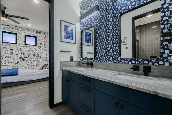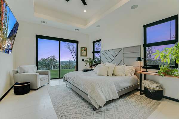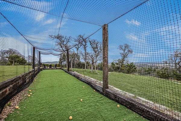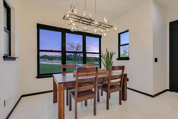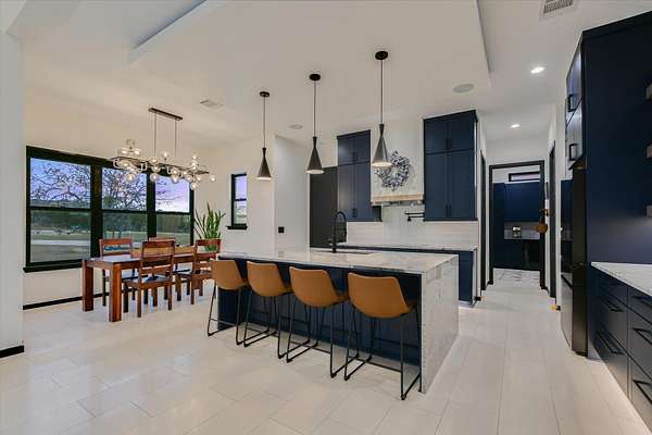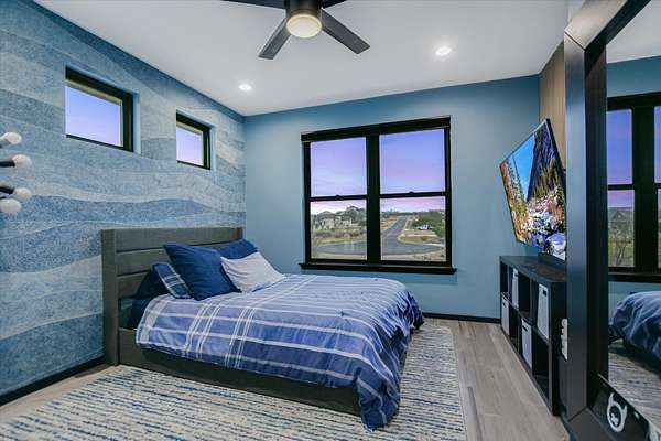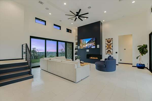 Designed as the builder's personal residence, this 5-bedroom, 3.5-bath estate rests on two private acres and captures some of the most majestic, uninterrupted views in the Texas Hill Country. Built in 2020, the home blends strength, sophistication, and thoughtful design. Soaring ceilings anchor the main living area, where a statement fireplace and 7.1 surround sound create a cinematic atmosphere. Expansive windows - tinted and fitted with solar screens - provide privacy without sacrificing the view. The kitchen is both art and function. Waterfall countertops cascade with clean lines. Floating shelves and a custom vent hood add architectural interest. A generously sized walk-in pantry keeps everything effortlessly organized. Just beyond, the first-floor laundry room doubles as a curated coffee bar space. The primary suite is a retreat unto itself. Located on the main level, it offers its own fireplace and 5.1 surround sound for an elevated, resort-style experience. The spa-inspired bath showcases floating cabinetry, custom granite accents, and abundant storage. Upstairs, four additional bedrooms and two baths surround a versatile flex space currently designed as a game room - ideal for entertaining or relaxed family living. Throughout the home, limestone and bamboo flooring provide seamless flow - no carpet. A custom batting cage, full irrigation system, and lower-level parking area further elevate the estate's functionality. In Eagle's Nest, views are expected. But views like this? They're unforgettable.