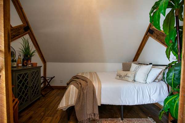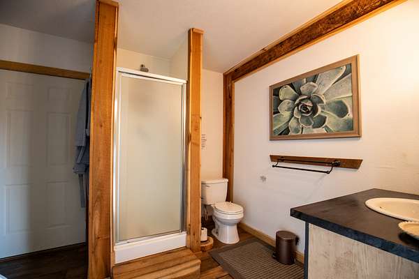 The primary bedroom feels like a peaceful sanctuary, providing warmth and comfort with elegant simplicity. The bathroom continues the theme, balancing rustic charm with contemporary touches to create a refreshing, rejuvenating space.