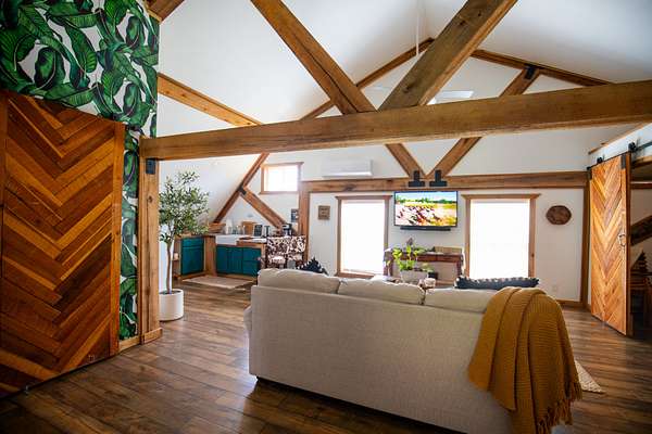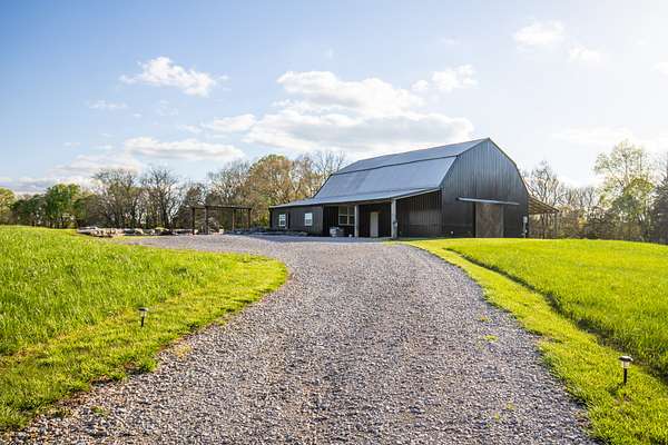 Set on 20 private acres just 50 minutes from Nashville, the home's rustic exterior gives way to an interior where vintage character meets modern comfort. Sunlight pours through large barn windows, highlighting the open-concept design with its reclaimed wood accents, high ceilings, and thoughtfully designed living spaces. The expansive great room invites both relaxation and entertaining, while the well-appointed kitchen offers a perfect blend of style and functionality.