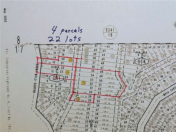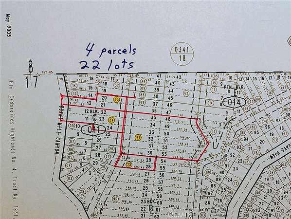 Est $326/mo22 contiguous lots in beautiful country near Silverwood Lake. Total square footage estimated approx 70,000 square feet. Four APNs. The three lots with frontage on Burnt Mill Canyon Road are lots 11, 12, and 13. The other lots are 20, 21, 22, 23, 24, 28, 29, 30, 31, 32, 33, 34, 35, 48, 49, 50, 51, 52 and 53. The APNs are 0343-012-71, 0343-012-72, 0343-011-33 and 0343-011-34.