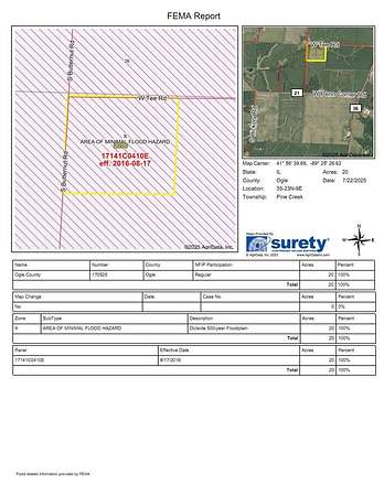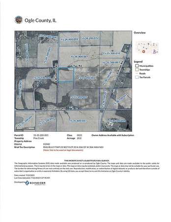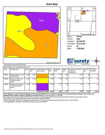 Check out this 20 acre parcel for sale in Pine Creek Twp. This hard to find property offers an opportunity for row crops as well as recreation and was reported to be a buildable parcel according to the Ogle Co. Zoning Office. Lot dimensions shown are approximate. Buyers are encouraged to verify all information prior to making an offer. This parcel is lease free for 2026. Possession is subject to the seller removing the 2025 crop. The PI is 113.4 and the soils are Birkbeck and Senachwine Silt Loam. This parcel is across the road from a 43.31 acre farm that is also listed for sale. See MLS number 12427339 for more information.